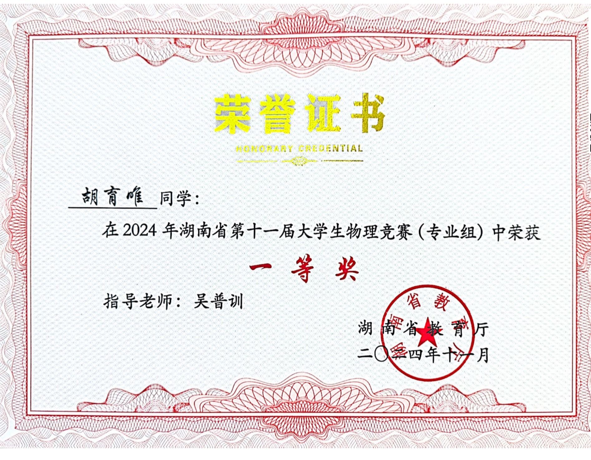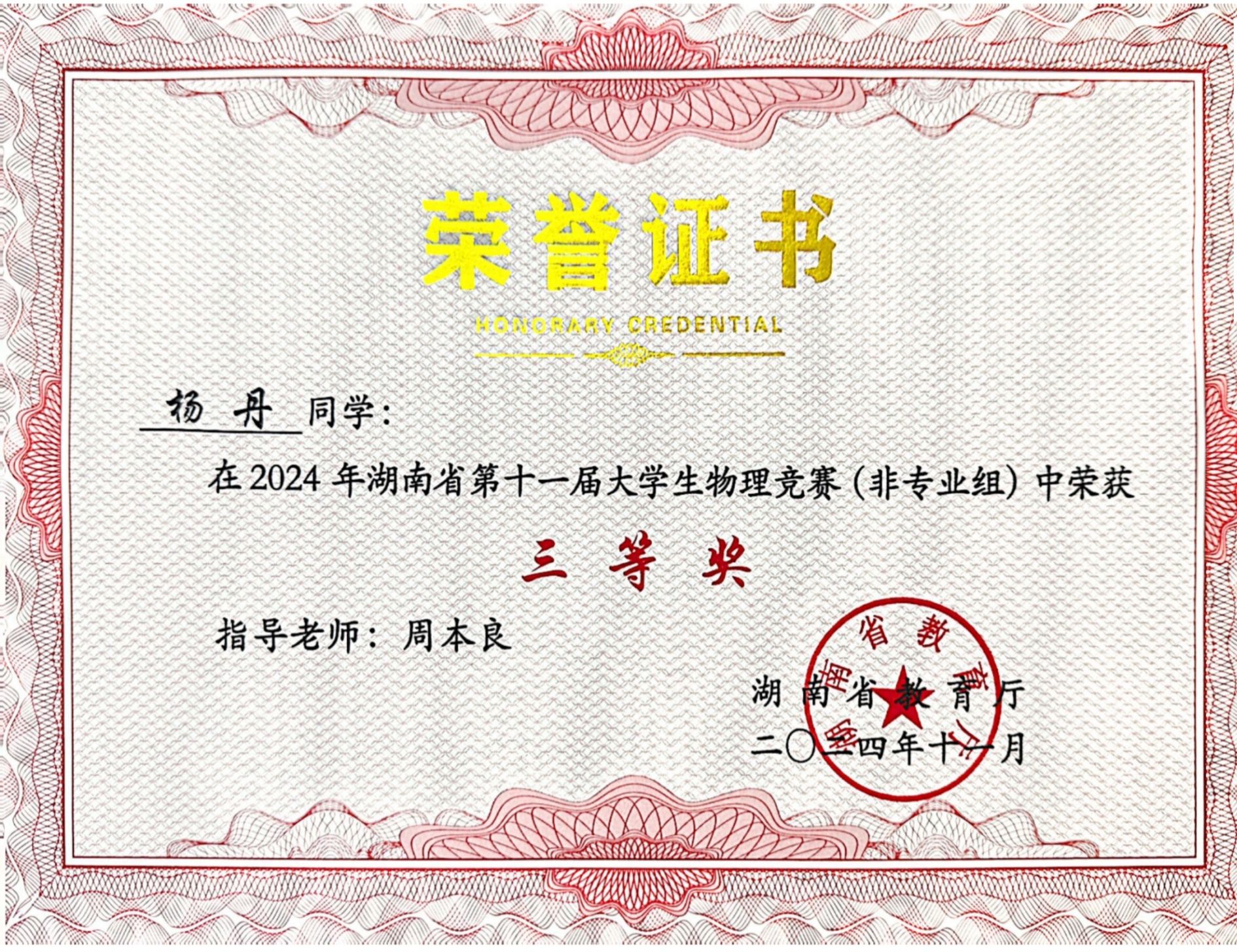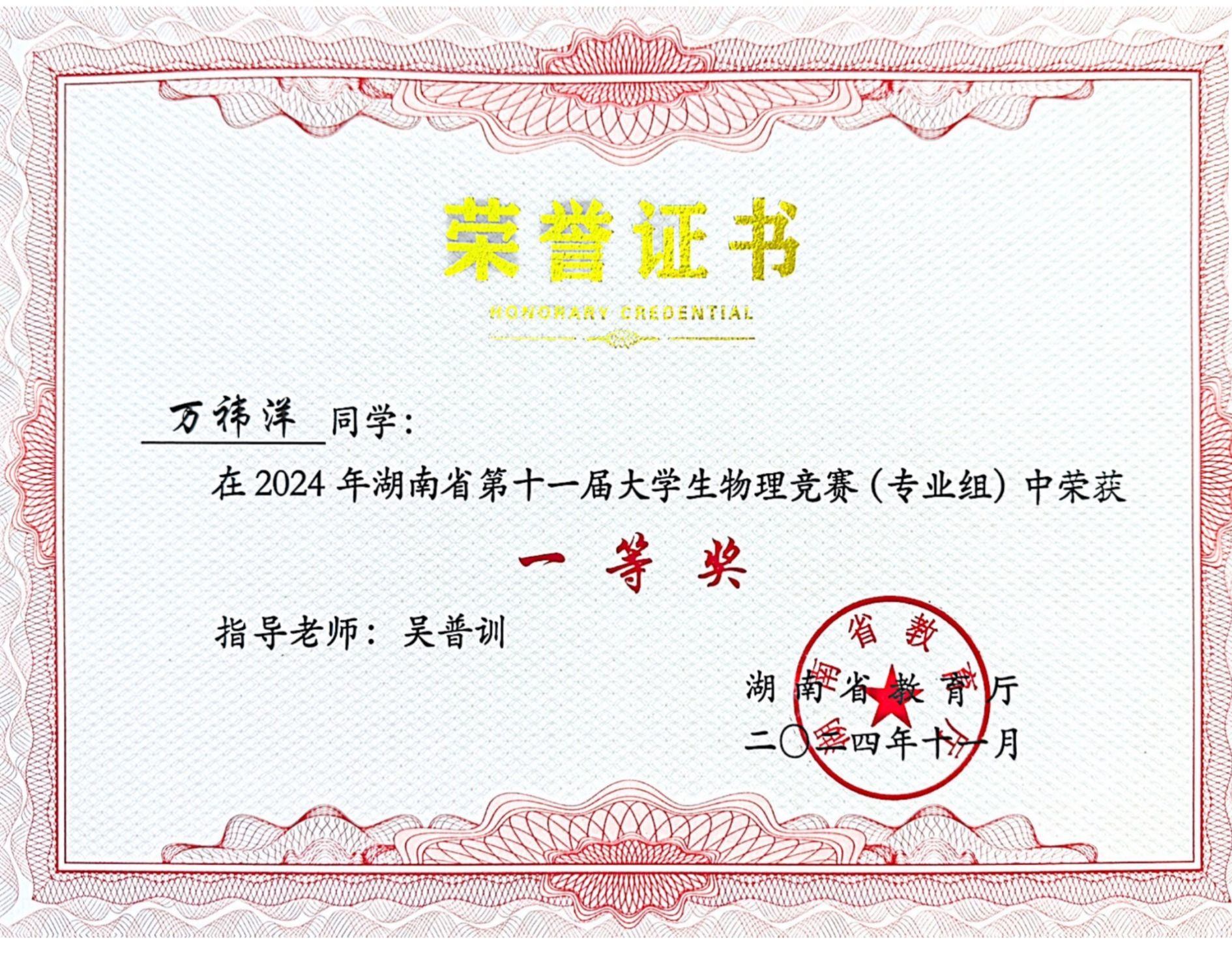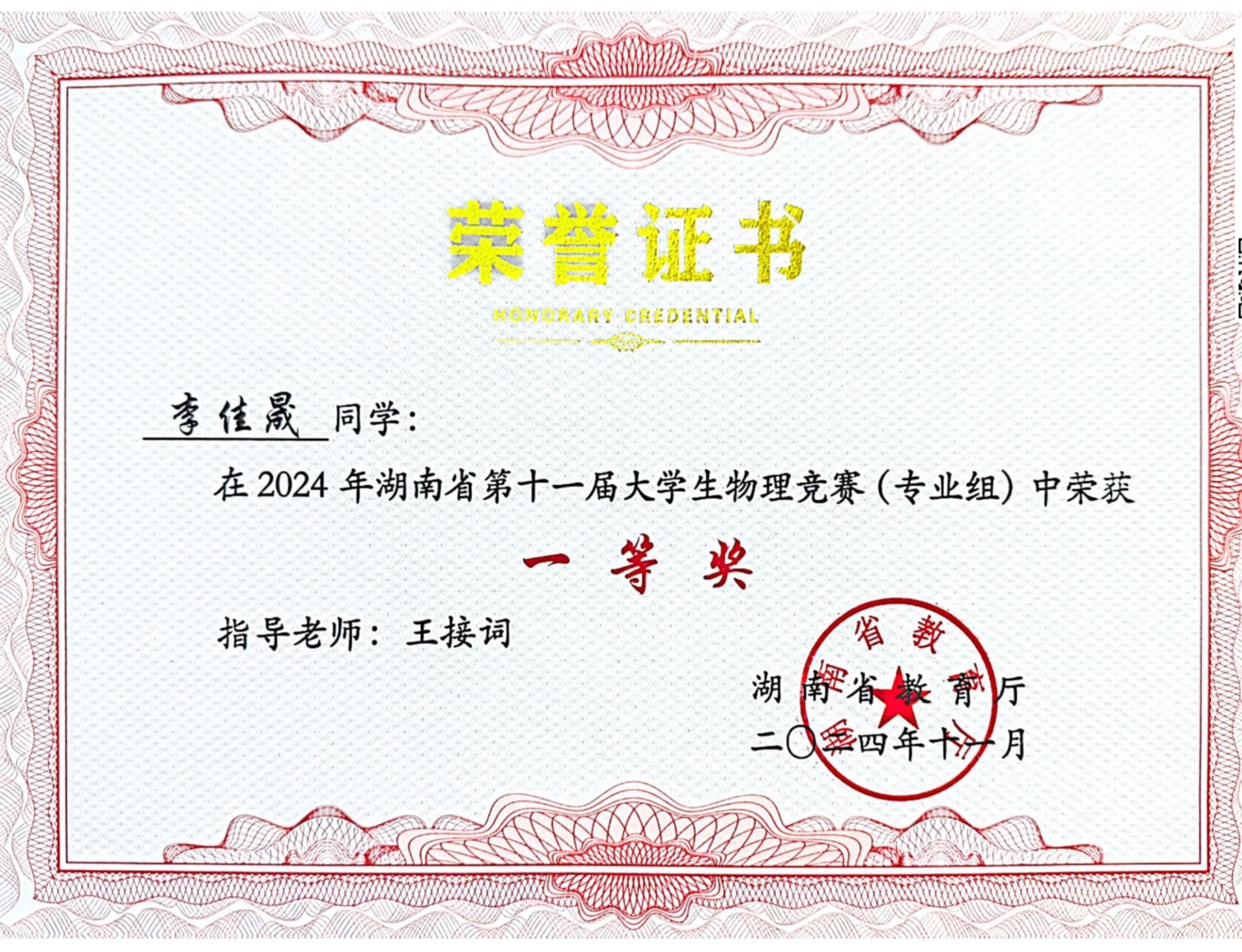 2024年湖南省第十一届大学生物理竞赛获奖