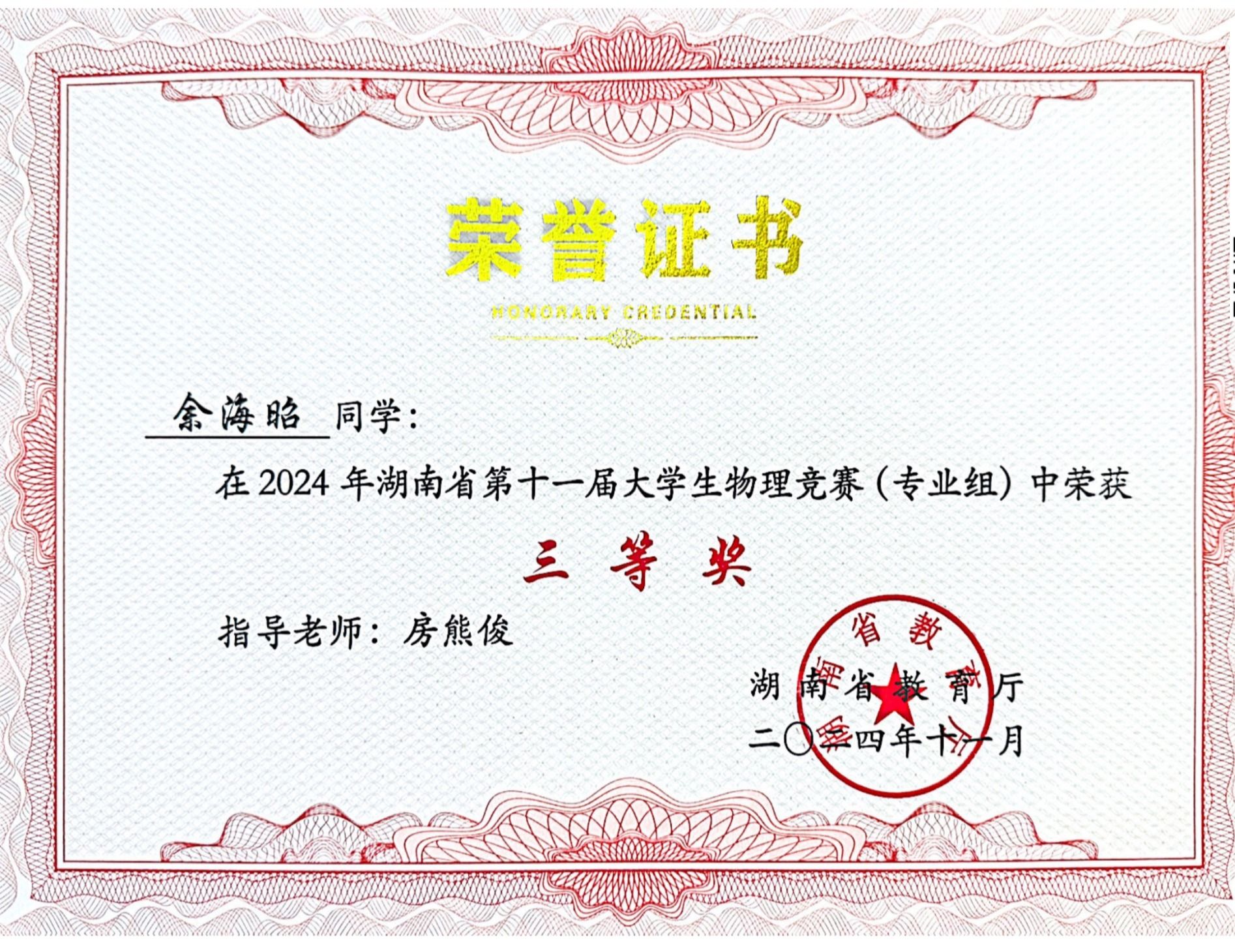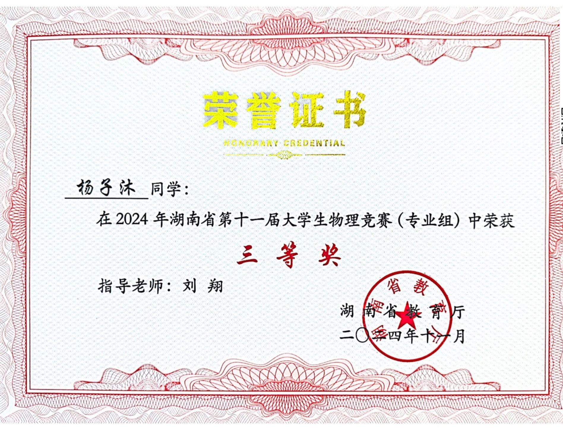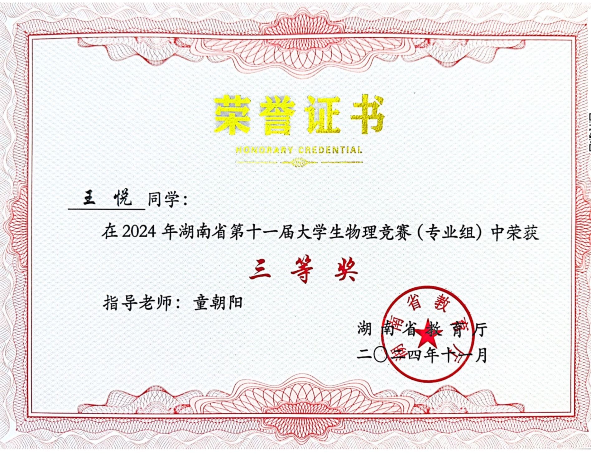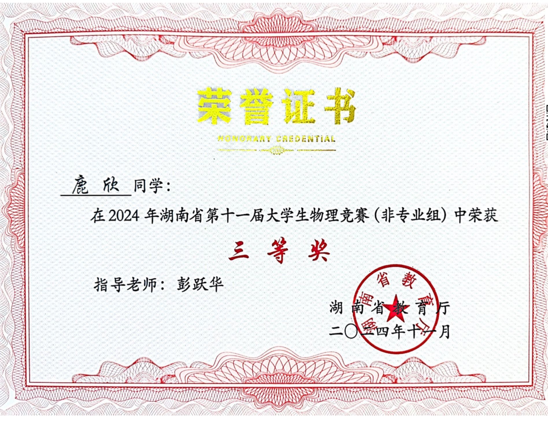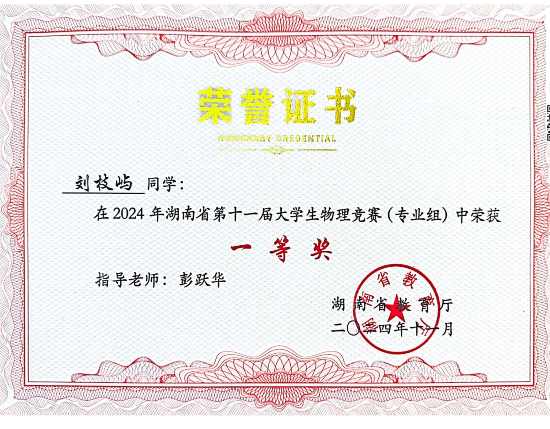 2024年湖南省第十一届大学生物理竞赛获奖