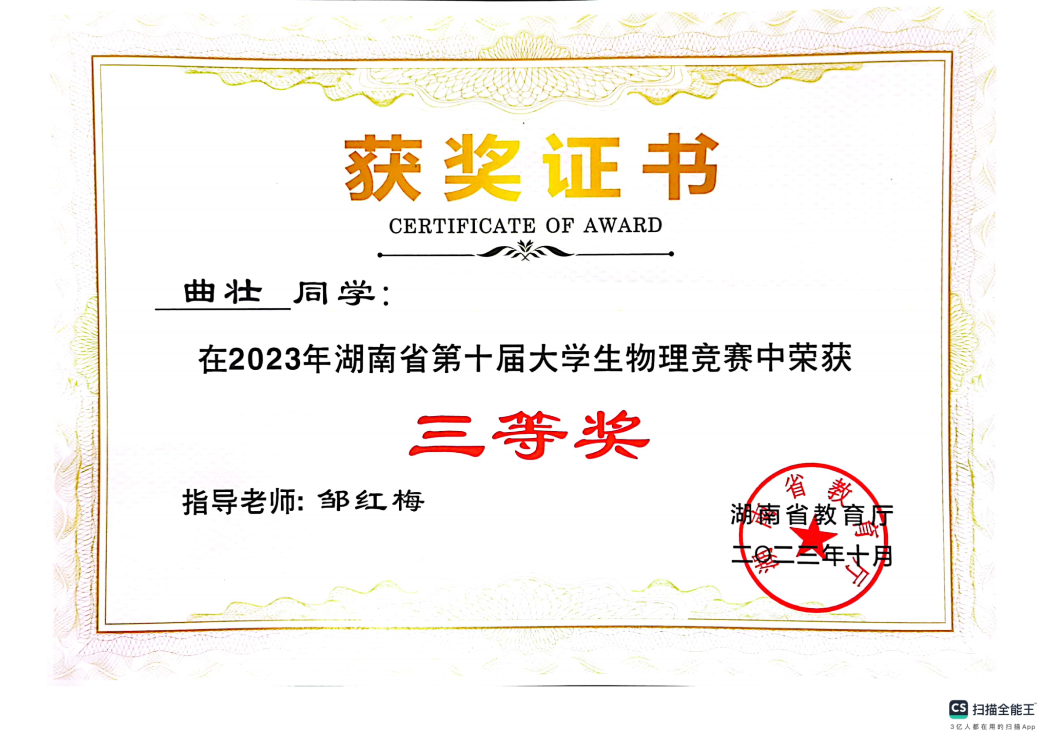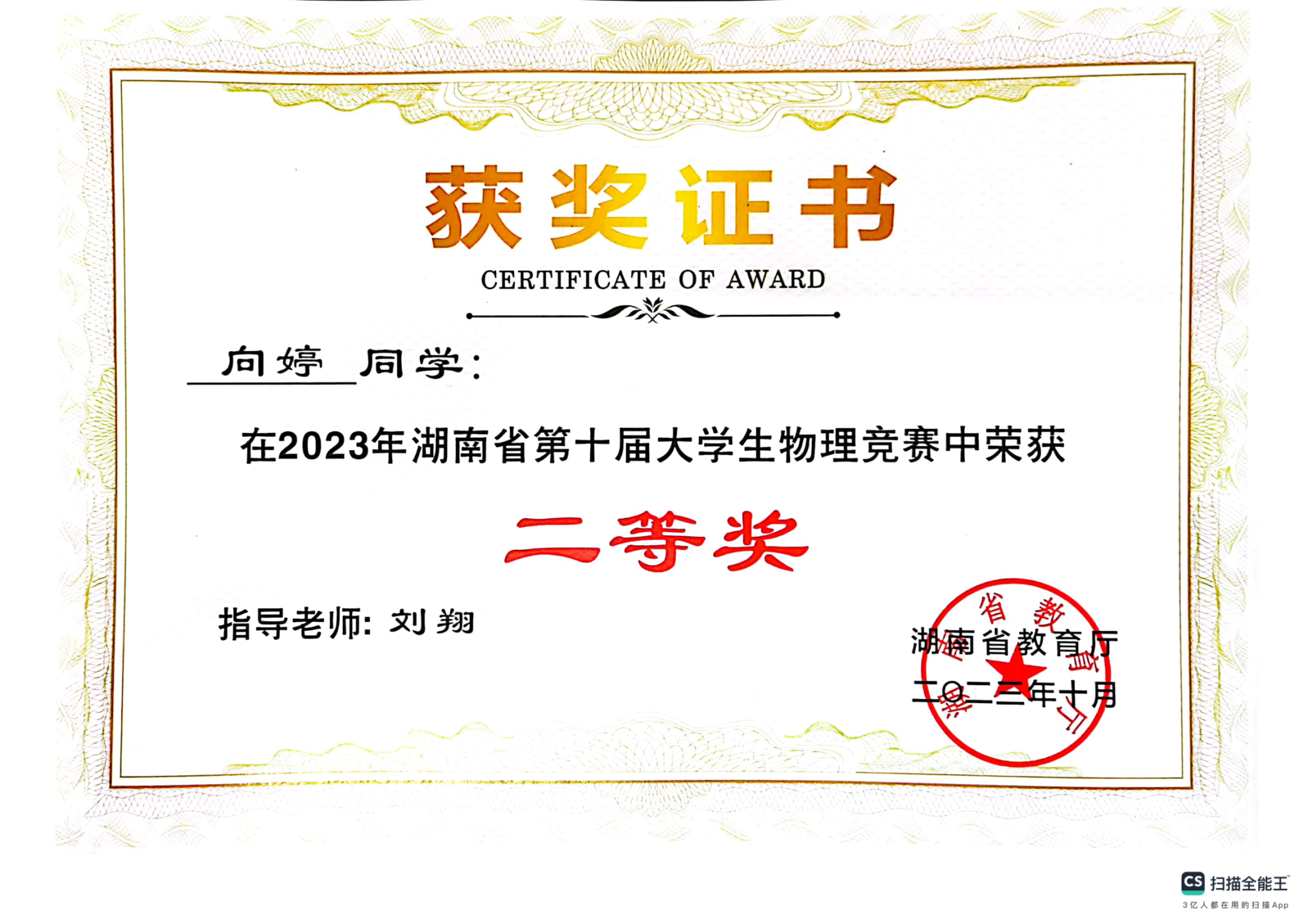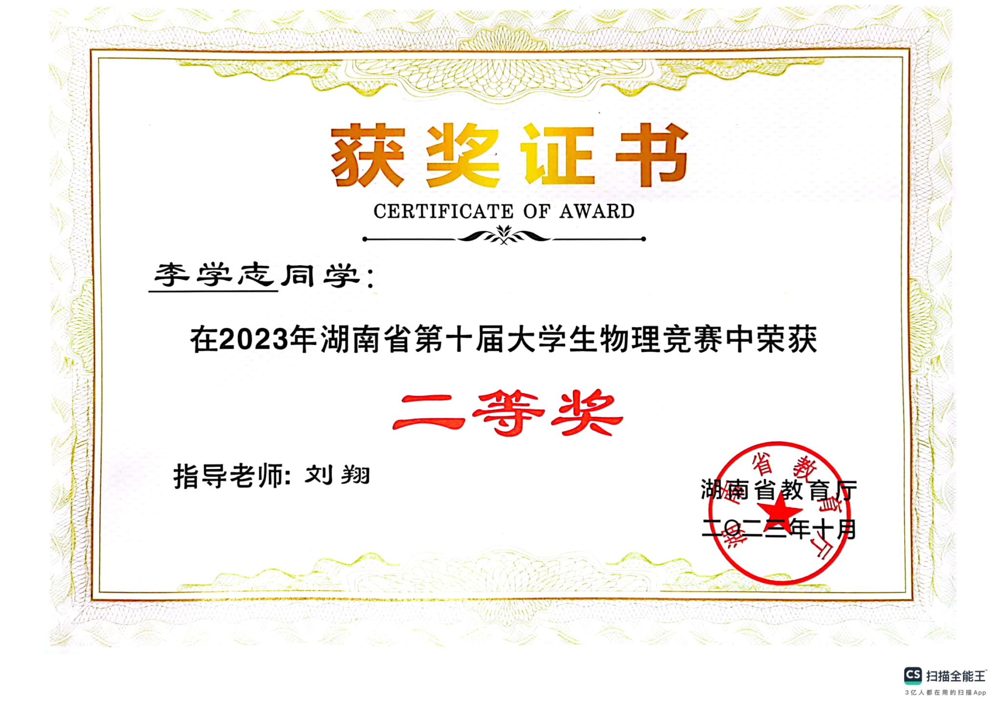 2023年湖南省第十届大学生物理竞赛获奖