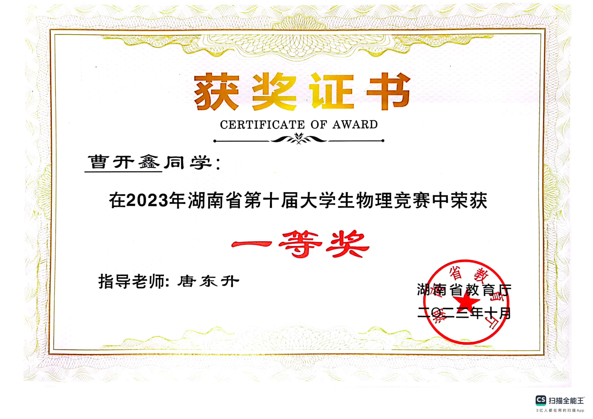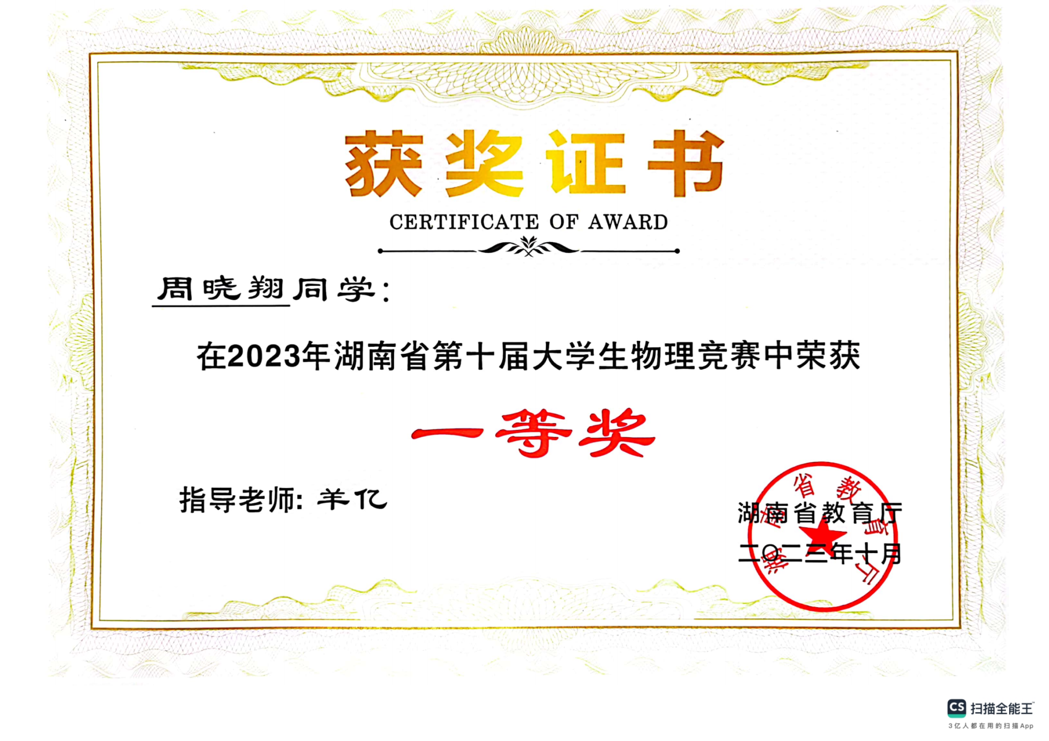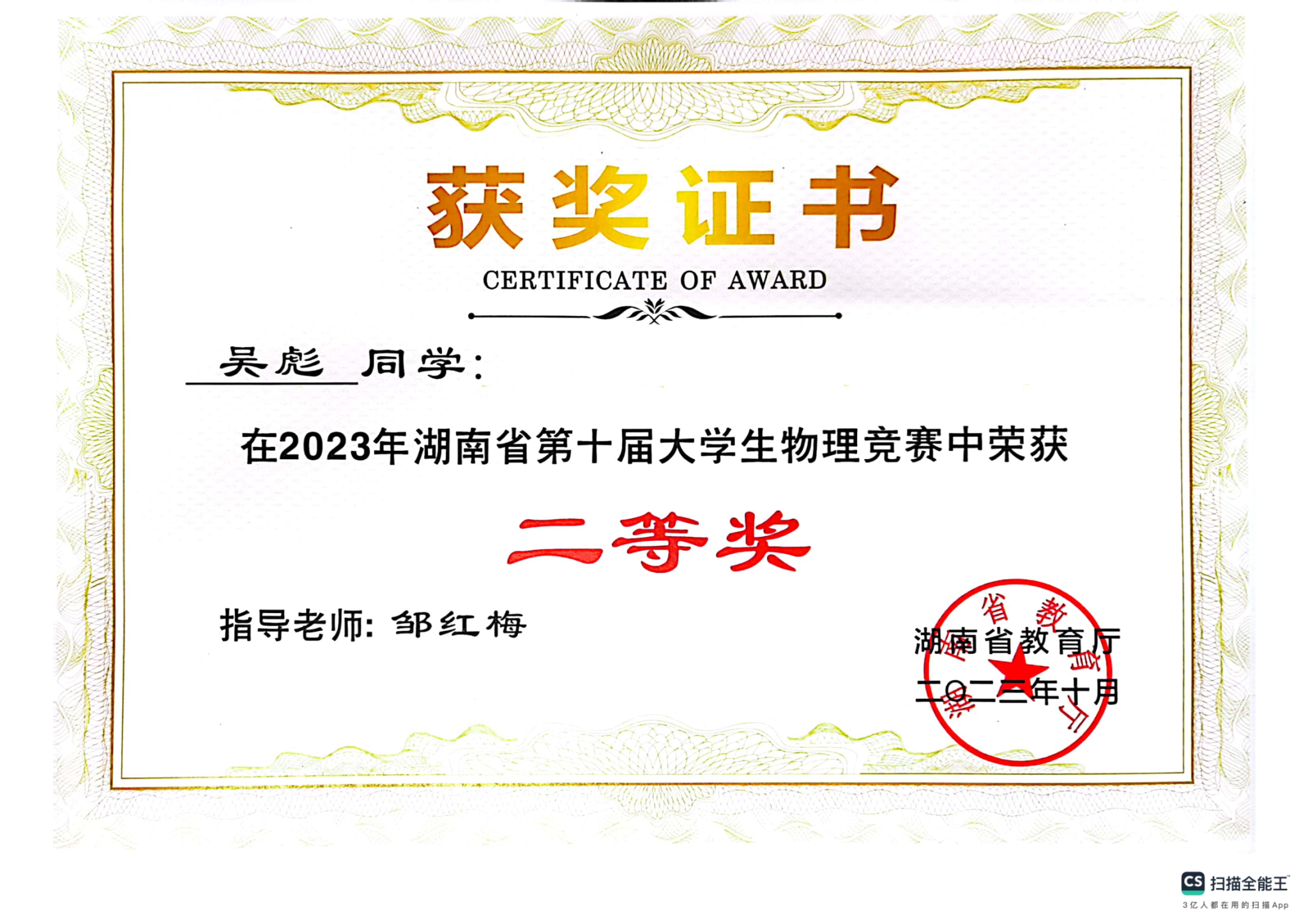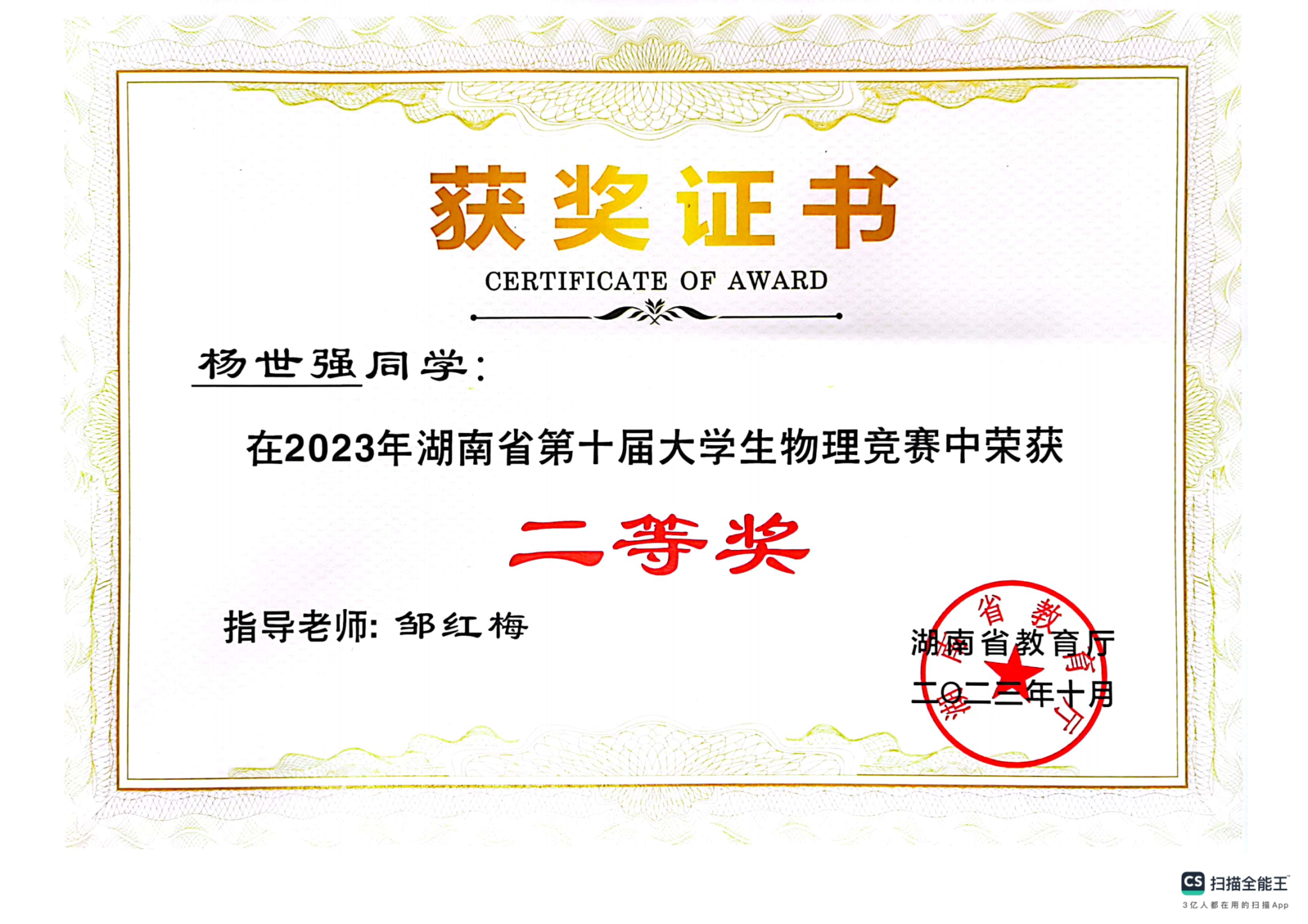 2023年湖南省第十届大学生物理竞赛获奖