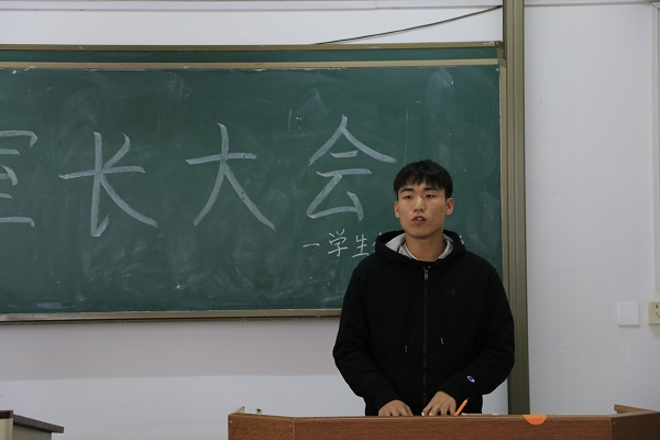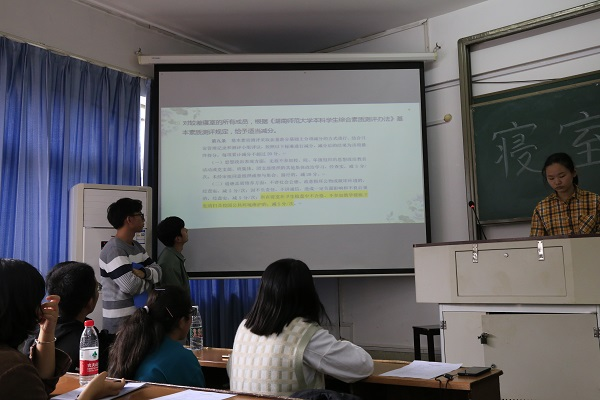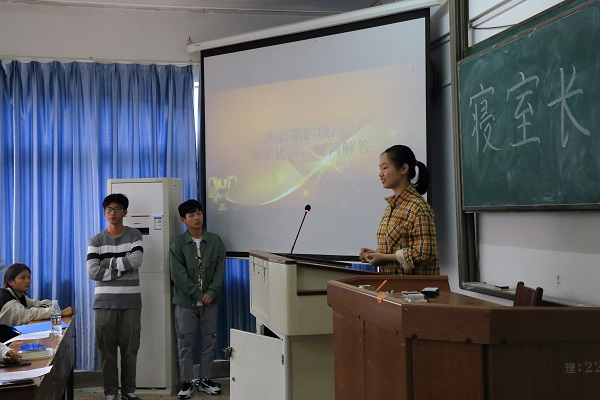 物电院学生会健康服务部成员向到场的各位同学作自我介绍。部长韩煦琳具体讲解了学院教室和寝室的卫生要求,说明了查寝的安排和评比方式,并展示了优秀寝室的图片。对于同学提出的有关寝室物品摆放等方面的疑问,她逐一作出回答,并表示将会结合第一次查寝的情况进行反馈。