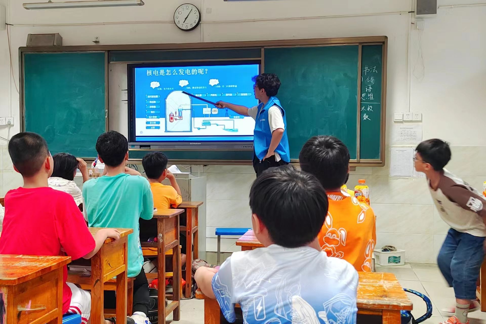 宣讲活动中,主讲人刘坤灵通过播放“一分钟了解核电站”的视频,帮助同学们形成了关于核电站的初步认识。他从能源发展的维度设问,鼓励学生们大胆展开设想,从而引出产生电的几种方式:火力发电、水力发电、核能发电、风力发电。他结合PPT内容深入浅出地讲解了环保生电的方式---核生电。