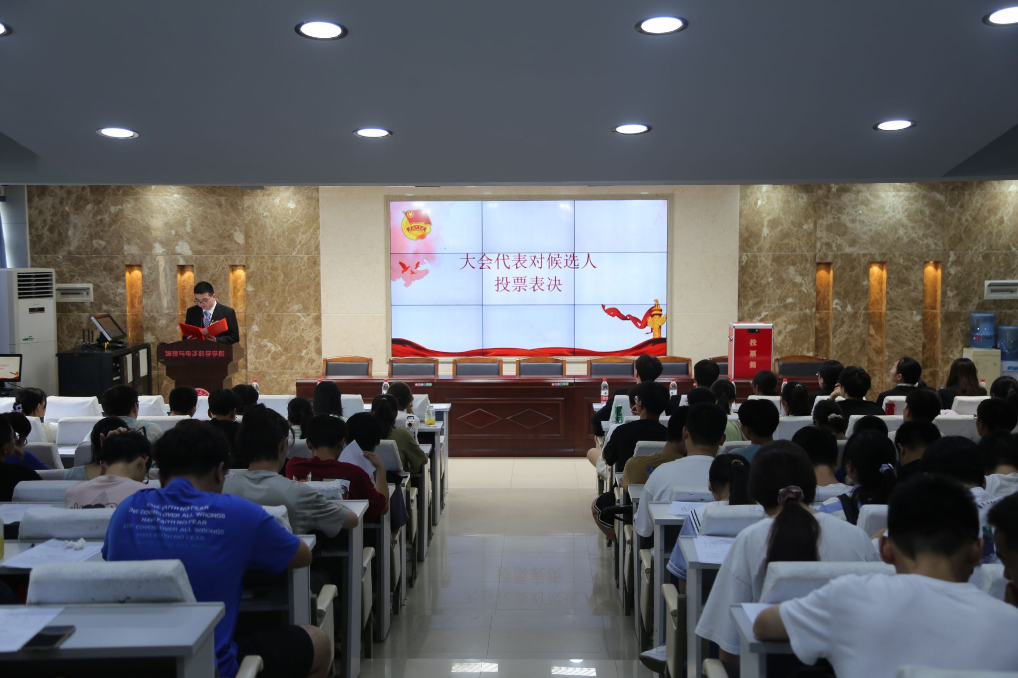 院团委学生副书记颜明伟、学生会主席团成员向婷、学社管主任汤子涵、青传主任戴一鸣和团委青发部部长尹德莉依次上台作2022-2023年度院团委、学生会、学社管、青传和提案工作报告,代表们对所有报告进行了投票表决。