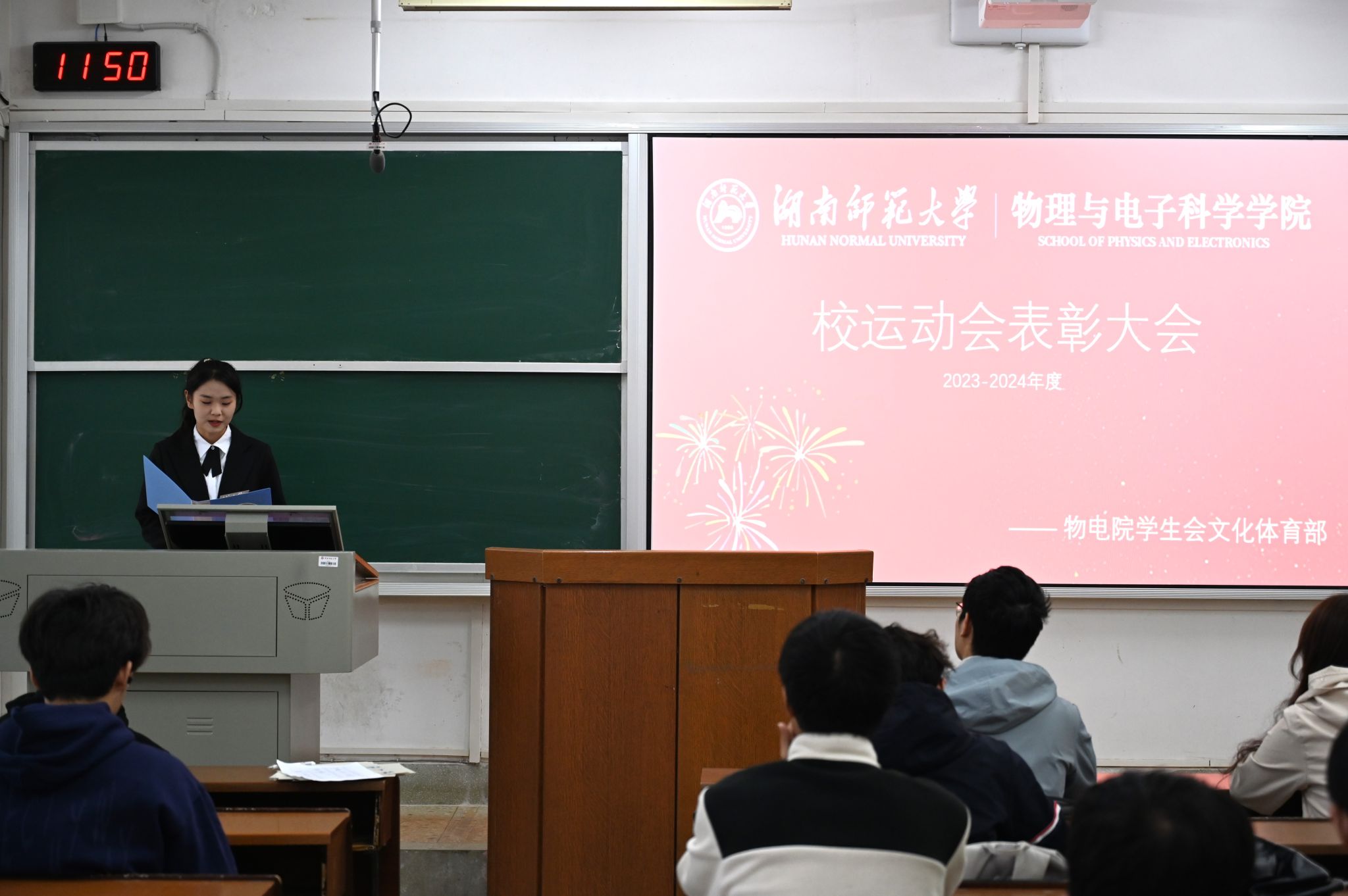 王燕宣读了物电院取得的优异成绩:男女团体总分第三名、男子团体第六名,女子团体第八名。她对学院老师们的关心和支持表示衷心感谢,并对运动健儿们表示热烈祝贺。她肯定了运动员们“胜不骄,败不馁”的精神,希望同学们将此拼搏精神带到学习、课堂中去,尽展物电风采。