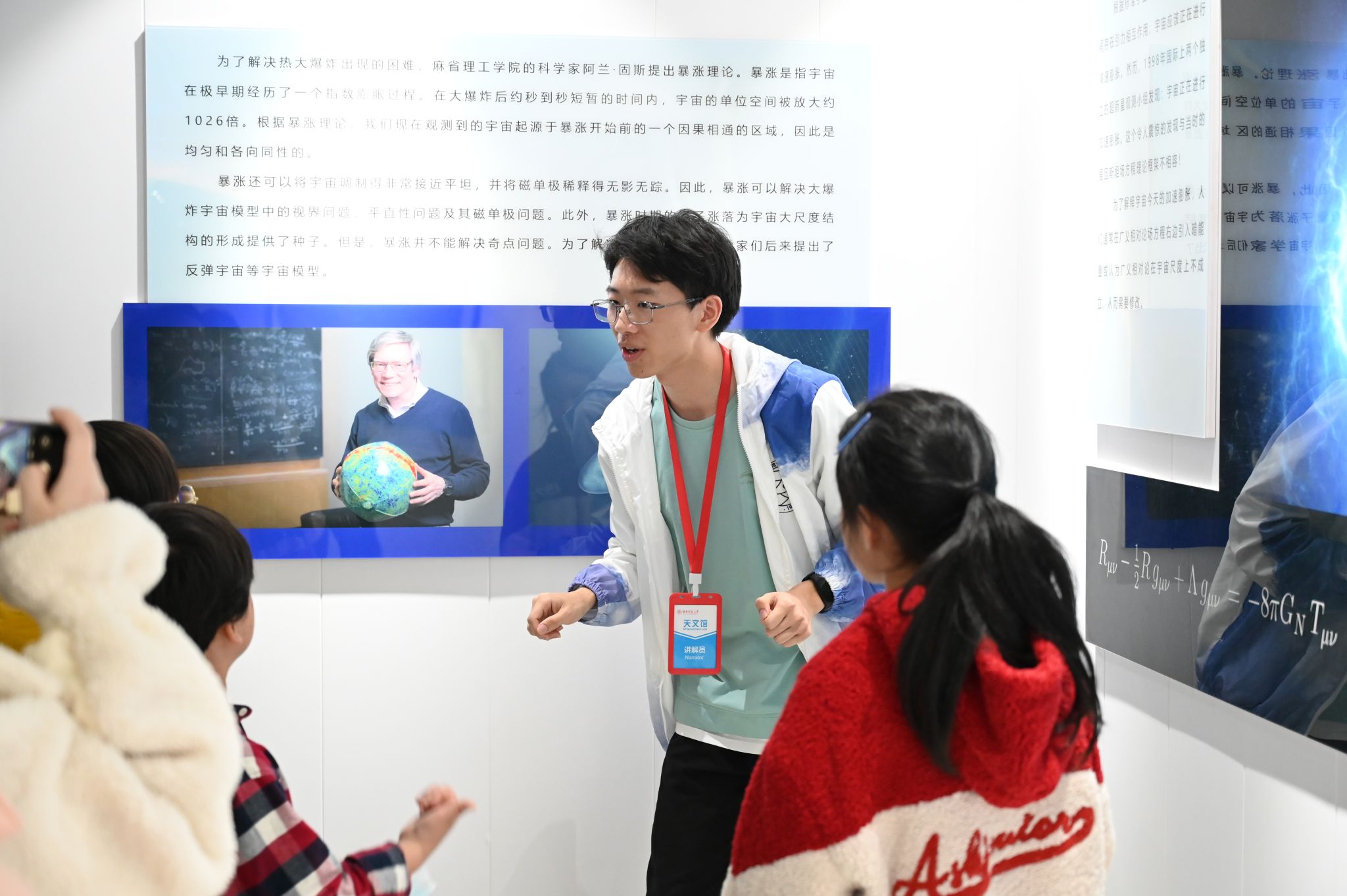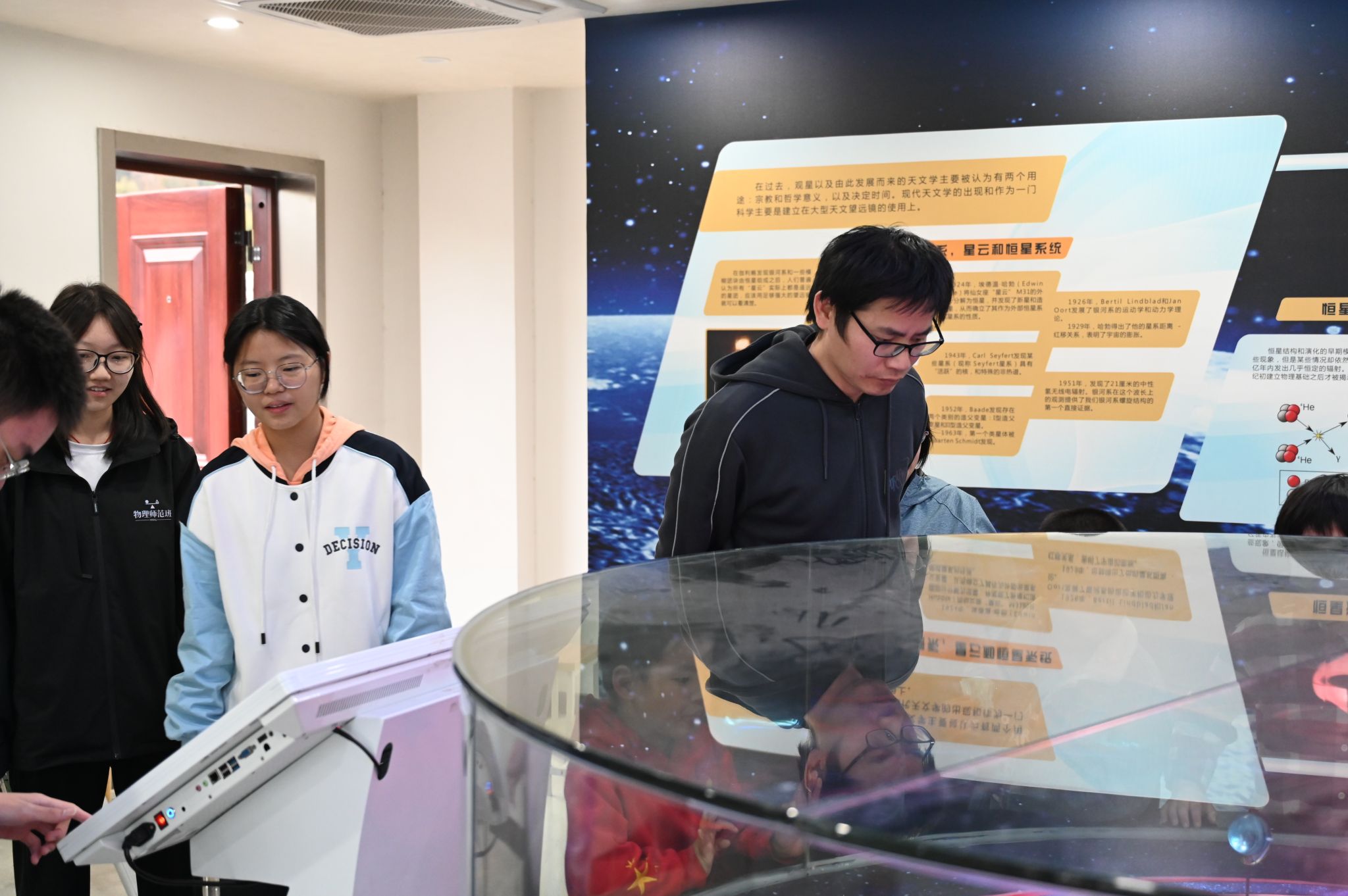 姚睿带领参观者参观诸侯ok1133天文馆,并介绍了馆内展厅相关天文科普内容与天文馆的内部建设。他从基本的天文知识切入,结合板块内容及天文相关视频,由浅入深地讲解了恒星演化、黑洞形成、太阳系行星运转等天文学知识。为使参观者更深入了解天文学学科,姚睿详细介绍了中国古代天文学发展史,具体说明了天文学对于古代社会生产方面,如纪时、纪年等所起到的重要作用。随着参观过程的推进,参观者们跟随姚睿来到天文馆露台观察专业望远镜和观测相关设备的内部构造,并学习观测原理。