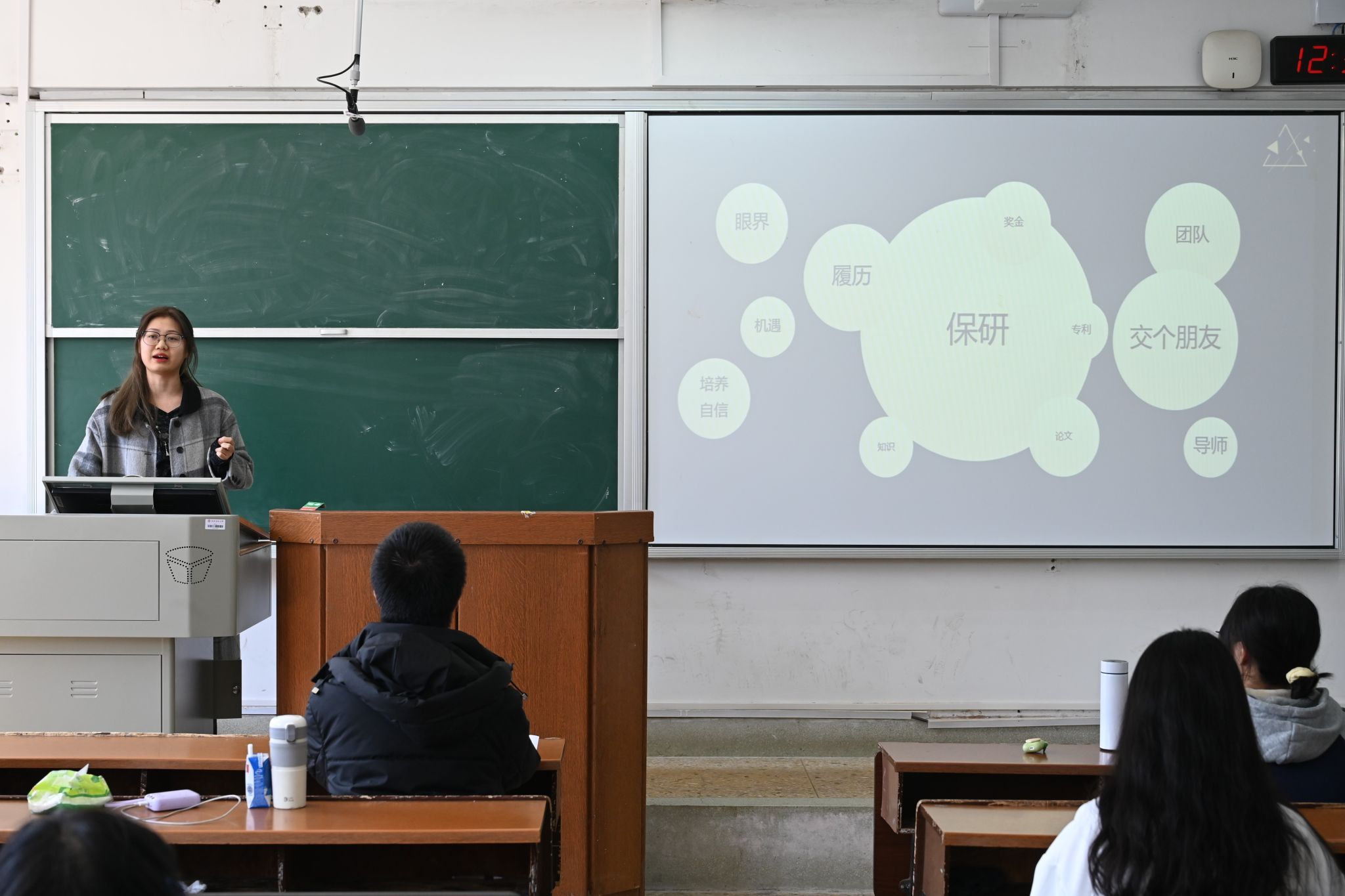 王维湘介绍挑战杯的核心应围绕科研创新开展,选材需具备新颖性、挑战性、实用性及可行性,以社会存在的真实问题为着力点,做好社会现实背景调查及研究方案。她结合自身参赛经验,讲解参赛答辩时的PPT应精准且醒目地呈现作品的核心技术、代码服务、经济效应及项目前景规划等重要内容,加强了同学们对“挑战杯”选题方向、撰写技巧等方面的理解。