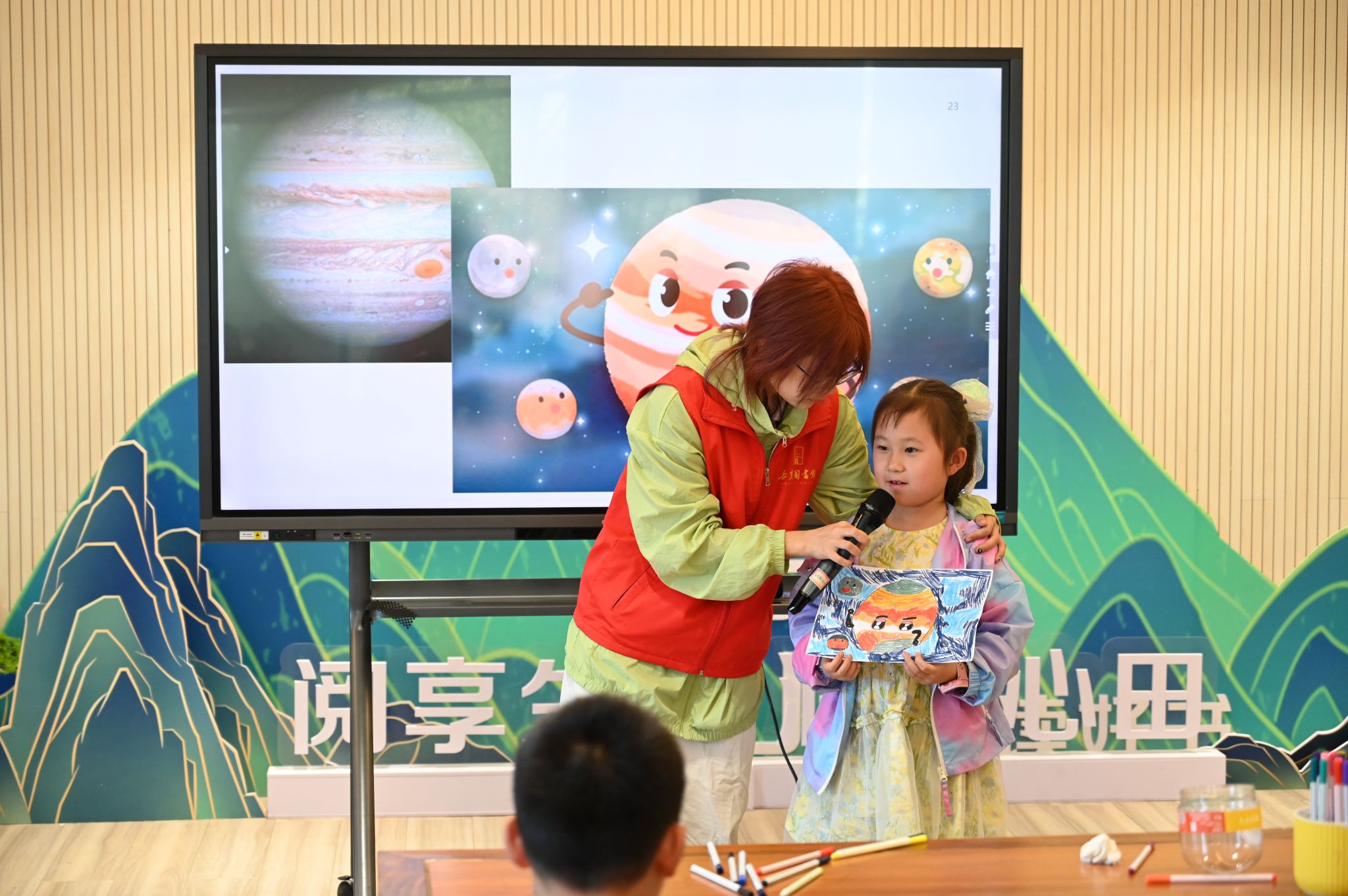 天文协会活动部理事从木星大小、质量、自转周期和公转周期等基本特征入手,并结合图文串讲,引领孩子们逐步了解木星的风暴天气、大红斑和独特的行星环。为引导孩子积极思考,提高其课堂专注度,天文协会活动部理事采用有奖问答的奖励机制,使孩子们带着问题更认真地观看视频,了解木星的卫星的相关知识。为加深孩子们对所学知识的印象,她设立“小小解说员”环节,鼓励并引导孩子们条理清晰地讲解木星。课程最后,在志愿者们的协助下,孩子们依据所学知识绘制出心中的木星并上前展示,提高了孩子们的动手能力及想象力。