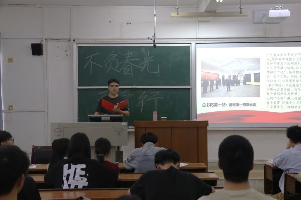 主讲人首先播放了一段视频展示习近平总书记考察湖南之行。他从发展教育事业、提高人民福祉、坚持科技创新等方面对习近平总书记在此次考察期间作出的重要讲话、重要指示进行介绍。他表示,青年学生要敢于适应新环境、迎接新挑战,大胆探索、勇于创新,破解发展难题,勇攀科技高峰,担负起科技强国的时代重任。要在科学理论武装头脑的同时,以实际行动诠释信仰追求。在研讨会的自由发言环节,共七名同学进行发言,他们从科技创新、教育事业发展等多个角度分析习近平总书记湖南行精神的内涵,表达自己的理解并提出相应的倡议。