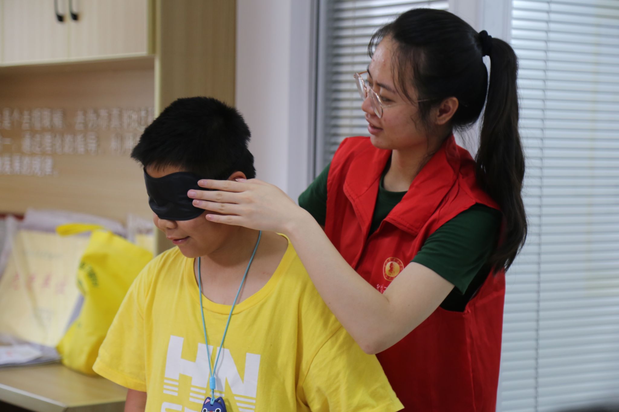 小朋友体验“蒙眼大冒险”游戏