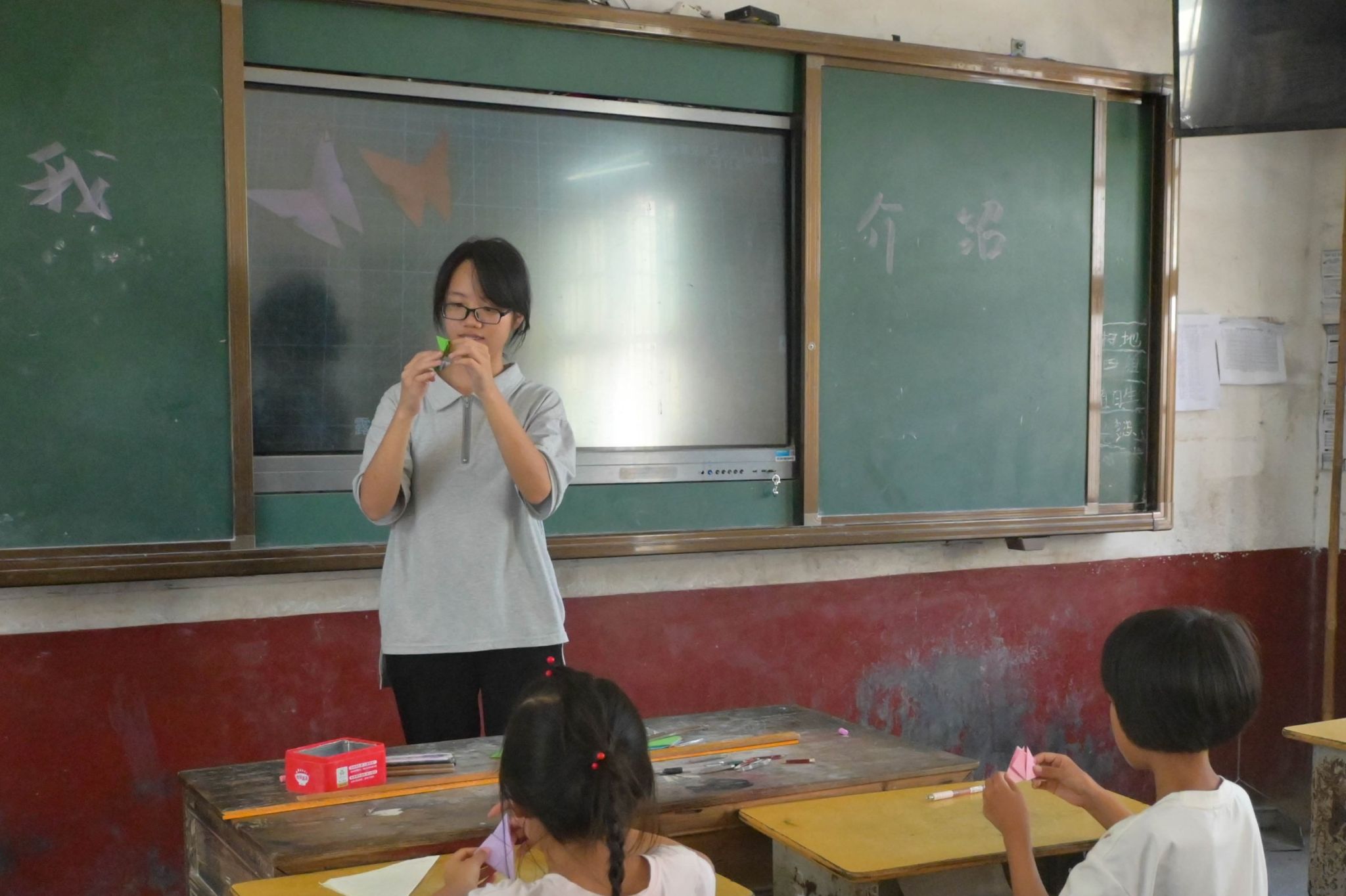 支教队成员韦雪桢和周湘丽分别为两个班级教授折纸。他们给学生播放折纸教学视频,亲手展示每一个折纸步骤。学生们跟随韦雪桢和周湘丽的教学,成功将卡纸折成了爱心和蝴蝶的形状。部分学生将折纸作品作为礼物赠予其他支教队成员。