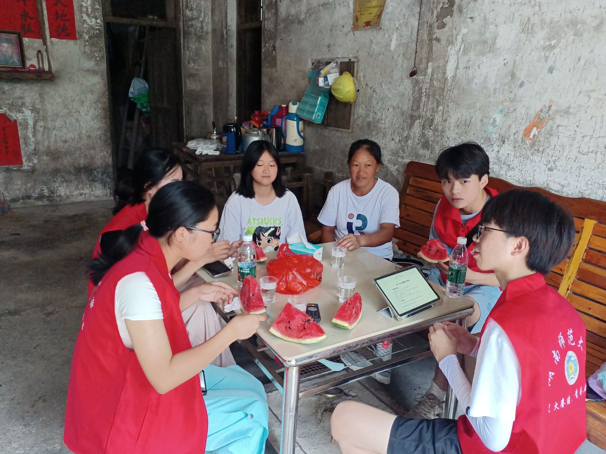 7月14日上午队员们分为四组,分别前往不同学生的家中。家访过程中,支教队员根据调研组制定的家访流程和访谈提纲,以学生学习和家庭状况为切入点,了解学生的心理和生理健康的相关情况。留守儿童因缺乏父母陪伴等原因,多数性格内向,易产生一些心理问题。因此,针对内向腼腆的学生,队员们采取了一对一面对面交流的方式,对他们进行心理疏导,勉励他们克服困难,做到自尊自信,健康快乐地成长。