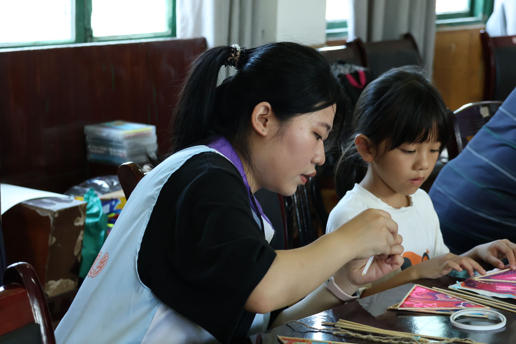 吴欢向孩子讲解水拓画花灯的制作方法