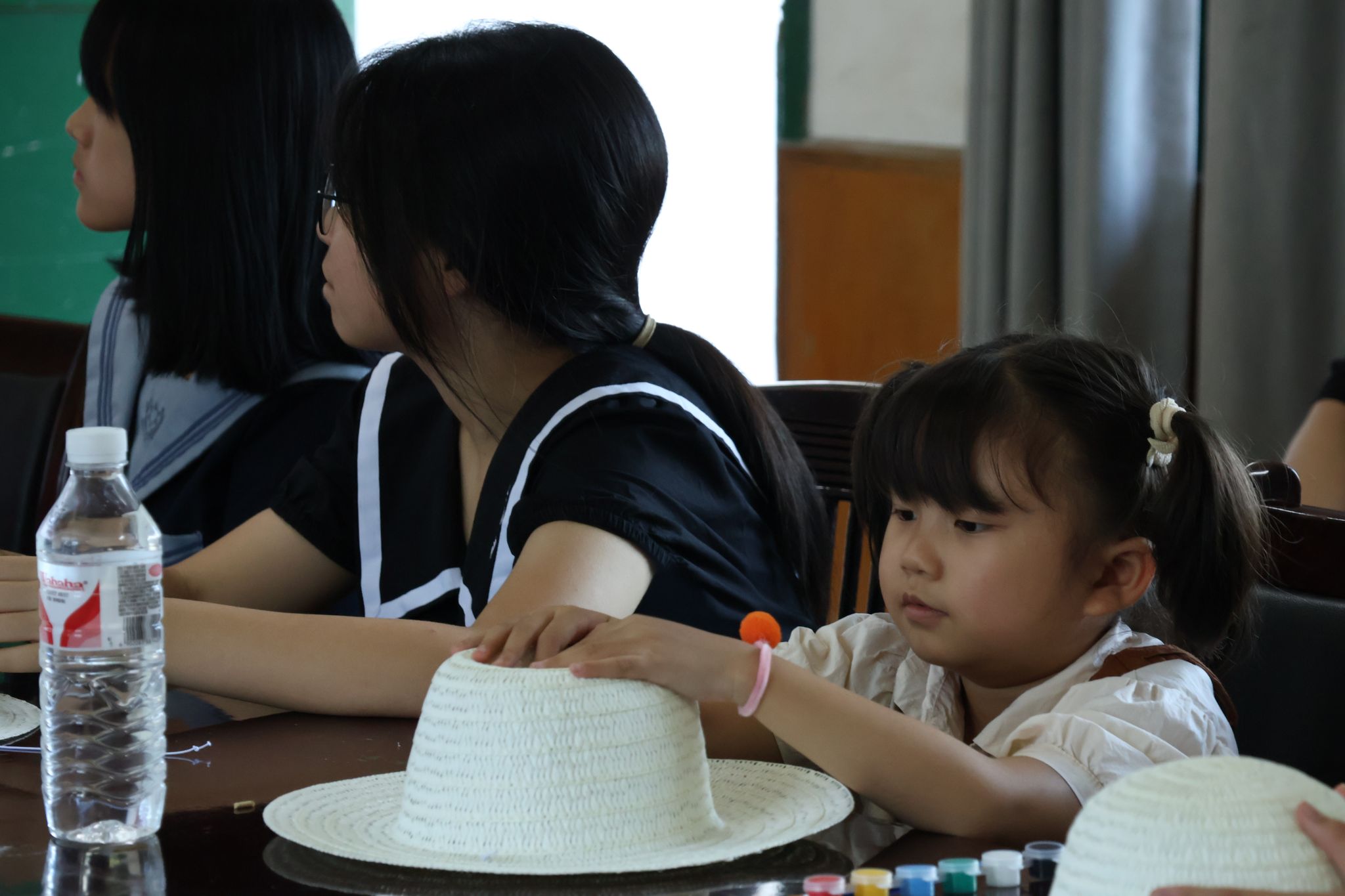 孩子们倾听苏湘文介绍并观察草帽