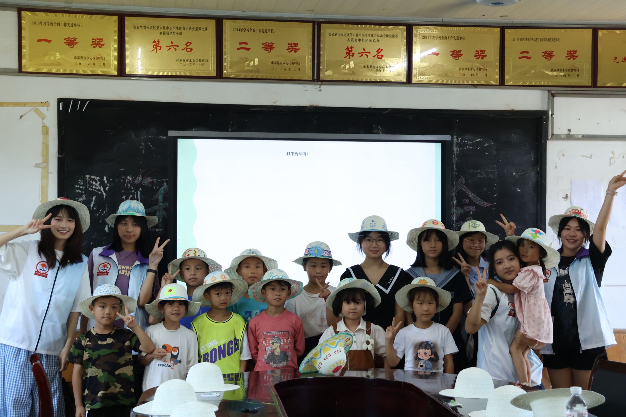 苏湘文借鉴传统服饰以及新改编的“西兰卡普”纹样作品的花纹样式展示了土家族“西兰卡普”的独特魅力。孩子们在服务队队员的指导与帮助下使用草帽、颜料等工具进行“西兰卡普”特色花纹草帽的创作。创作过程中,孩子们发挥想象力,不拘泥于所展示的草帽成品样式,巧妙运用画笔绘画出带有“西兰卡普”特色纹样的草帽,帽子上的花纹栩栩如生,孩子们的想象天马行空。课后,服务队队员与孩子们合影留念,为这堂绘画趣味课画上句号。