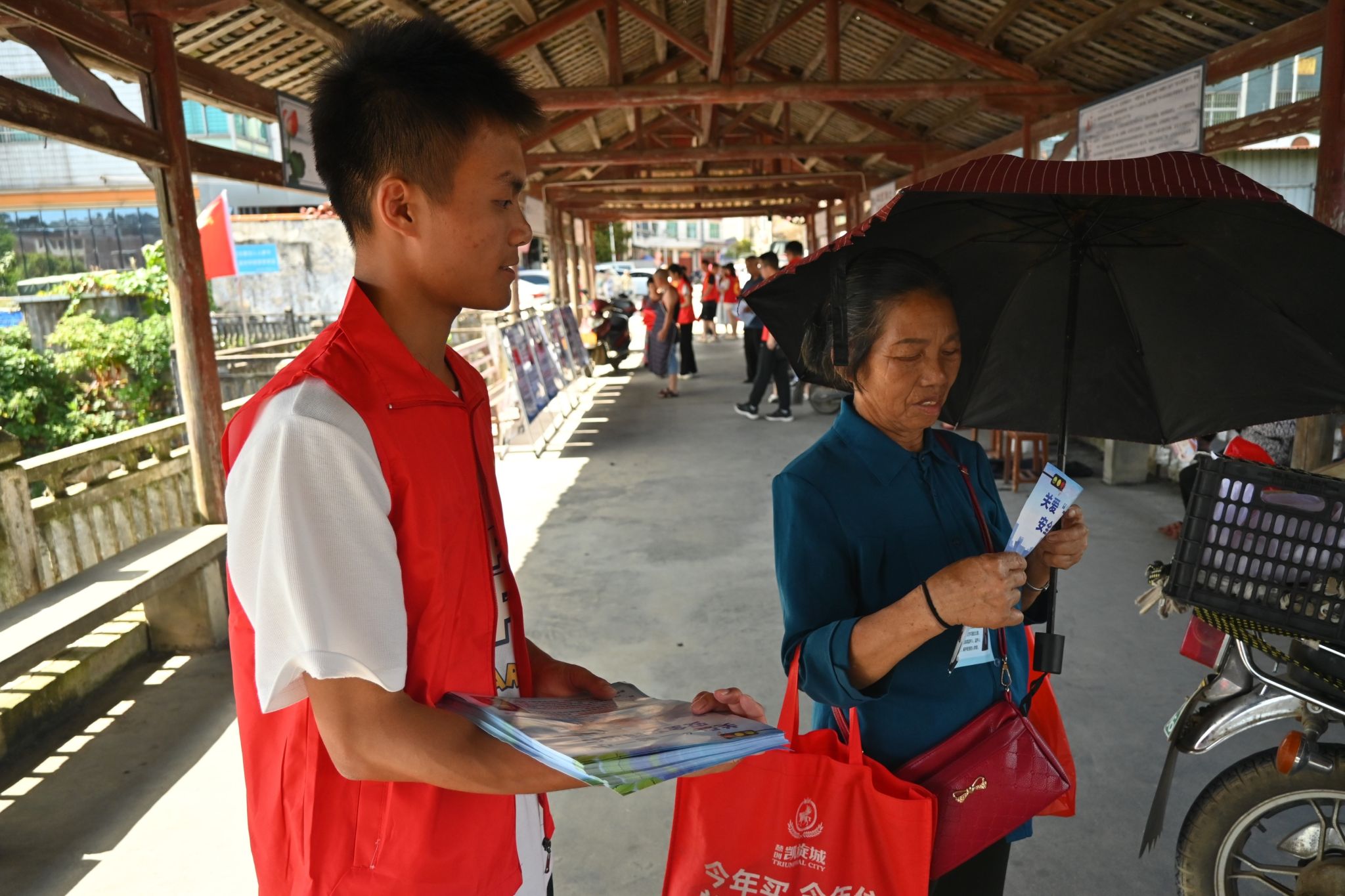支教队成员在集市分发传单