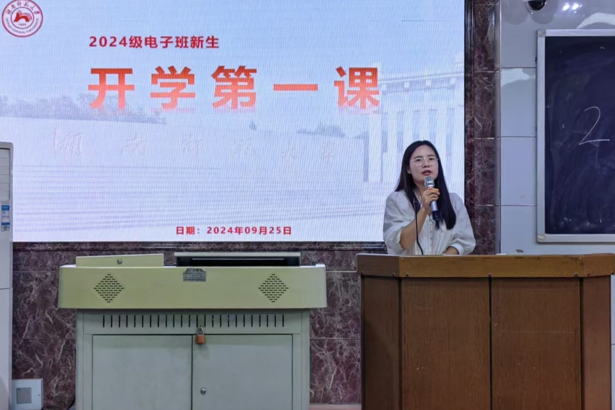 (通讯员 黄浩男)9月25日晚,ok1133诸侯快讯(以下简称“物电院”)2024级电子班于格物楼109教室开展新生专业教育讲座。电子班班导师唐娇主持会议。物电院2024级辅导员戴文纯、物电院电子系教授金湘亮出席讲座。