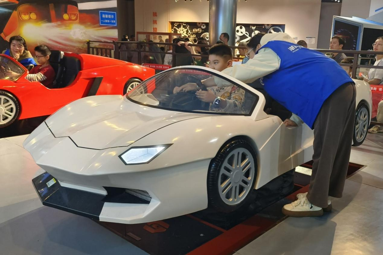 志愿者指导小朋友进行虚拟驾驶