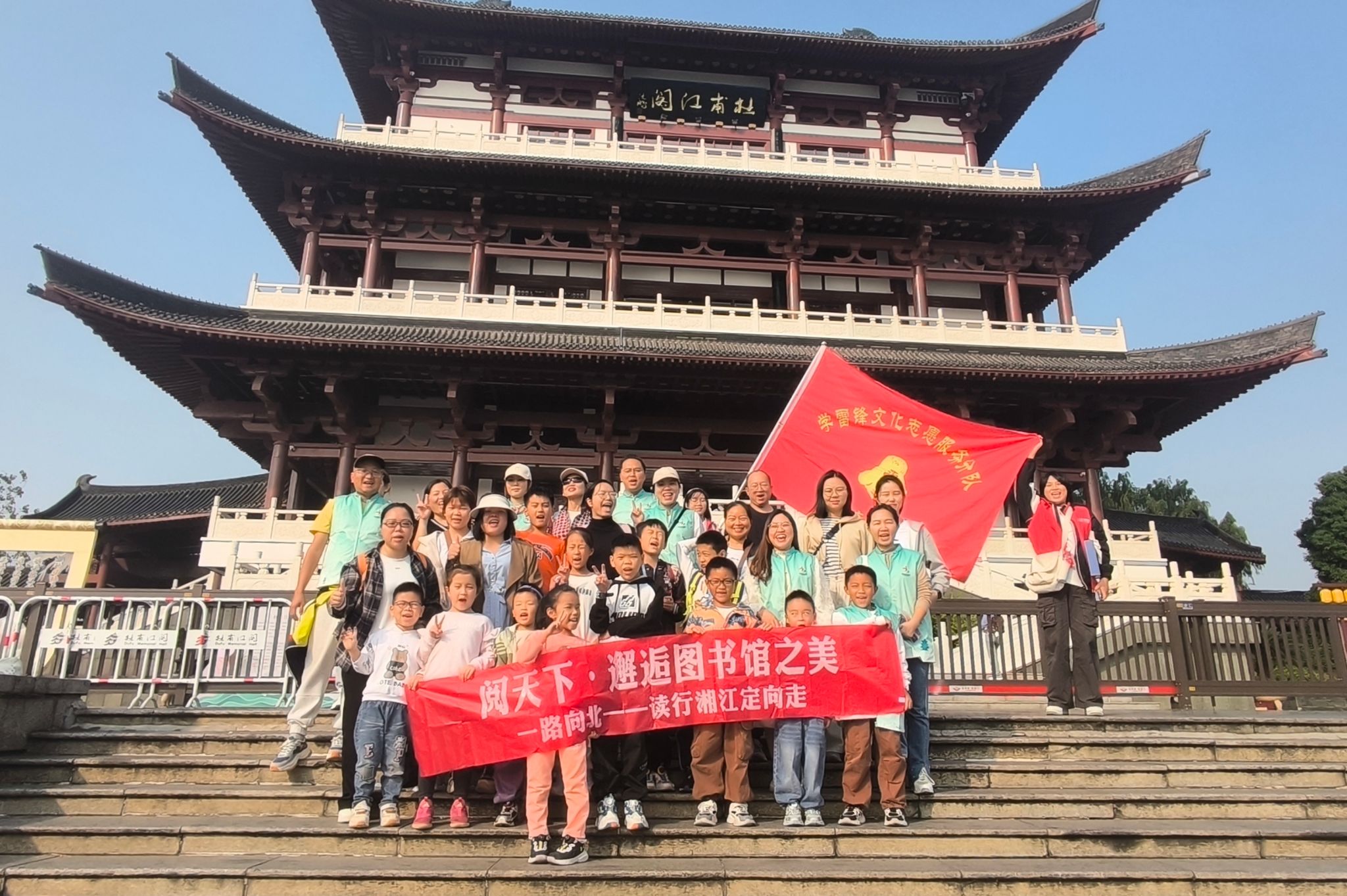 志愿者带领小朋友们漫步于湘江之畔,探访杜甫江阁,他们沉浸于杜甫诗句的意境中,共同领略长沙这座城市的独特韵味。九八抗洪纪念碑前,志愿者向小朋友们介绍了《沁园春·长沙》一诗的时代背景,并通过细致入微的诗句解析与写作手法赏析,引导孩子们深切感受到诗中洋溢的壮志豪情与磅礴气势。在充分理解诗歌精髓后,志愿者与小朋友们齐声诵读《沁园春·长沙》,并录制下这段朗诵视频作为纪念。活动结束后,志愿者和小朋友们一起徒步走至长沙市图书馆进行合影留念。