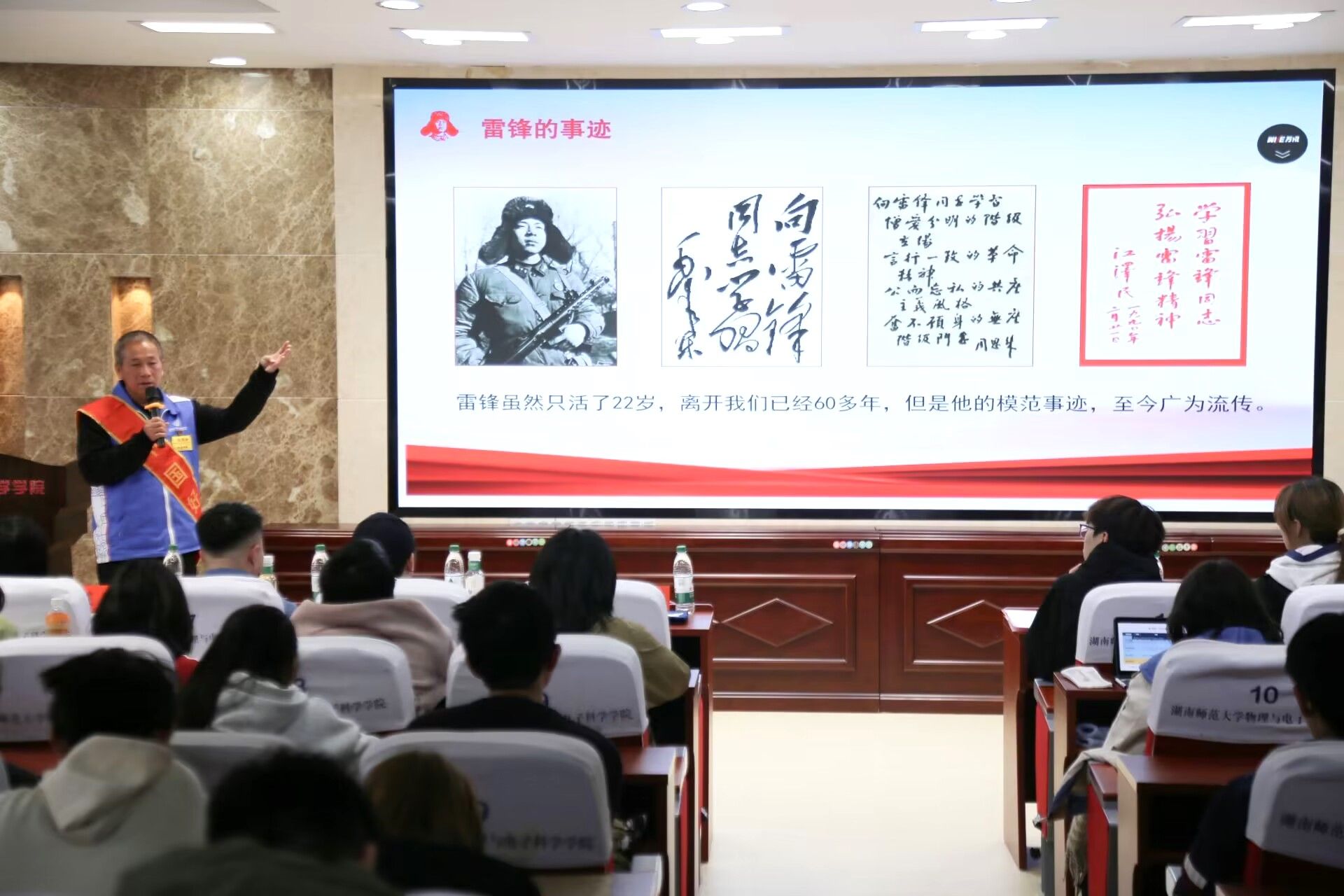 活动开场,全体成员合唱团歌。主持人介绍前期宣传工作以及主讲人嘉宾。院团委青年志愿者工作部部长何佳威以视频的形式展现了志愿活动的意义与乐趣。胡凯威以PPT的形式介绍了谢子龙影像艺术馆,详细说明了艺术馆的志愿者培训内容与计划,鼓励青年志愿者的加入。袁亮坤声情并茂地向观众们阐述了雷锋精神,并讲述自己学习雷锋精神的光荣事迹。梁翔讲述了自己参加志愿活动的成长历程。各位主讲人的发言让听众们不仅对志愿活动有了更多了解,也体会到投身志愿服务的深远意义。