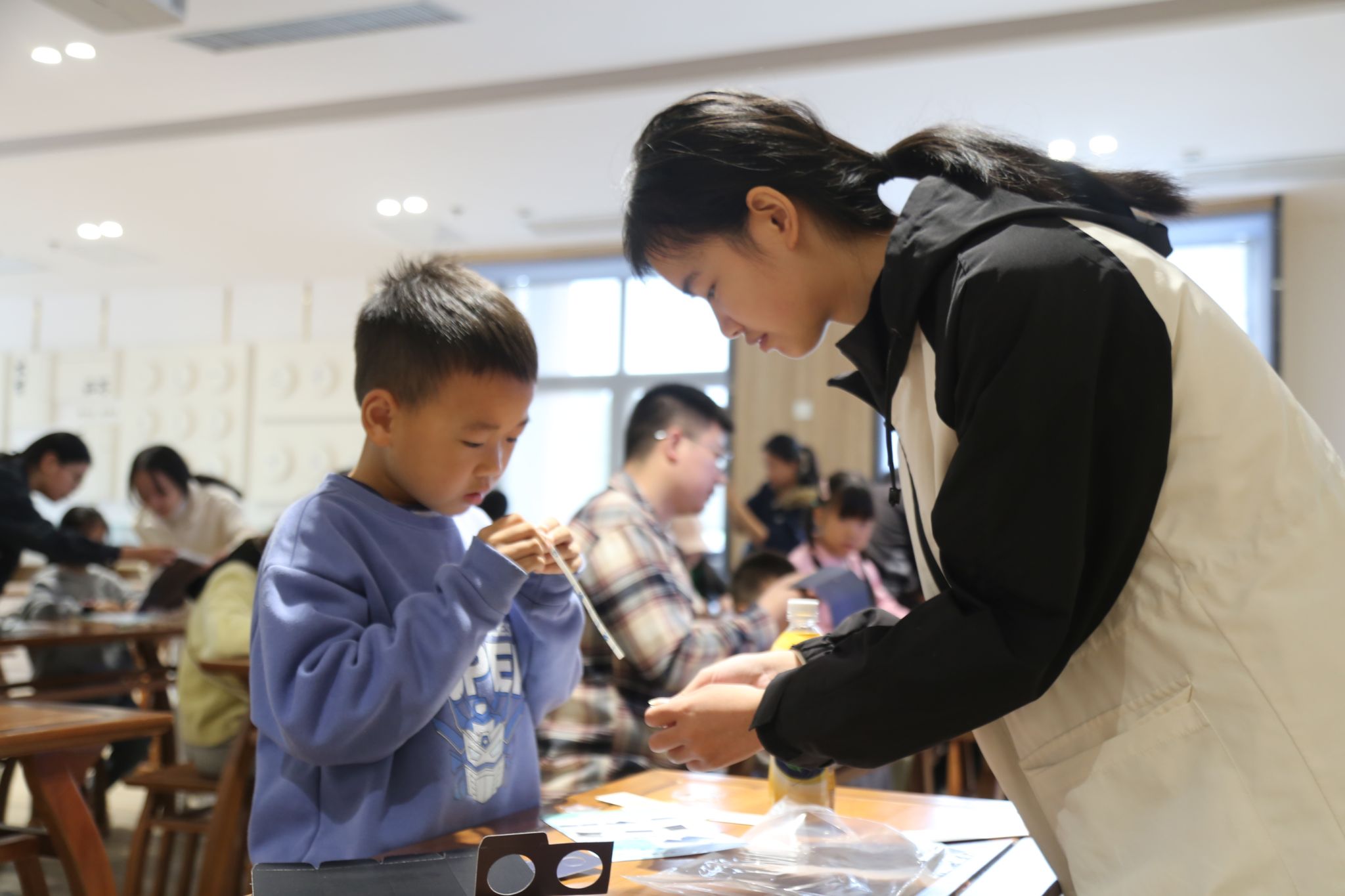 在读书会开始前,参与活动的小朋友有序入场并就座,现场志愿者协助引导,为活动顺利开展提供了支持。活动中,主讲人通过展示绚丽的星空图像,启发小朋友们思考流星的形成原理,随后用生动易懂的语言讲解了相关天文知识。在讲解过程中,辅以插画与视频材料,帮助参与者增强对流星现象的理解,并拓展了天文观测方面的基础知识。现场小朋友积极参与互动并回答问题,主讲人则对提问作出解答并给予鼓励。在随后的手工环节中,志愿者组织亲子家庭共同制作望远镜,并耐心指导大家完成手工作品。