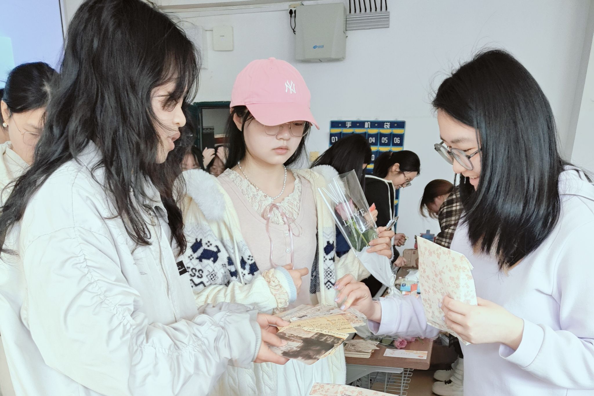 在“以花换物”环节中,参与者自带书籍、文具、小饰品等物品,并附上手写祝福卡片,以物换花,传递心意。工作人员为每位参与者送上鲜花及空白明信片,供其书写祝福或寄语。所有物品与明信片统一封装为“春日盲盒”,参与者可随机抽取一份,收获未知的温暖与惊喜。活动现场气氛温馨,互动频繁,充分体现了同学们之间的善意与关怀。