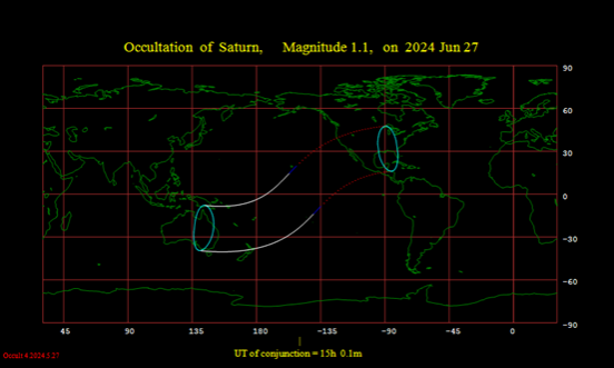 2024年6月27日23:00土星合月(视赤经23h24m13s),地心所见土星在月球以南仅0.08度,太平洋可见月掩土星。国内而言,28日凌晨从东方升起,0.9等的土星在月球上侧,位于宝瓶座,非常接近。所以很值得一看吧。