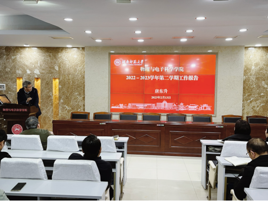 2月13日下午,学院在格物楼509报告厅召开2023年新学期教职工大会,总结2022年学院工作,并对新学期各项工作进行了全面部署安排。校纪委书记姚春梅教授,原副校长、低维量子结构与调控教育部重点实验室主任匡乐满教授出席会议,会议由副院长李友明主持。