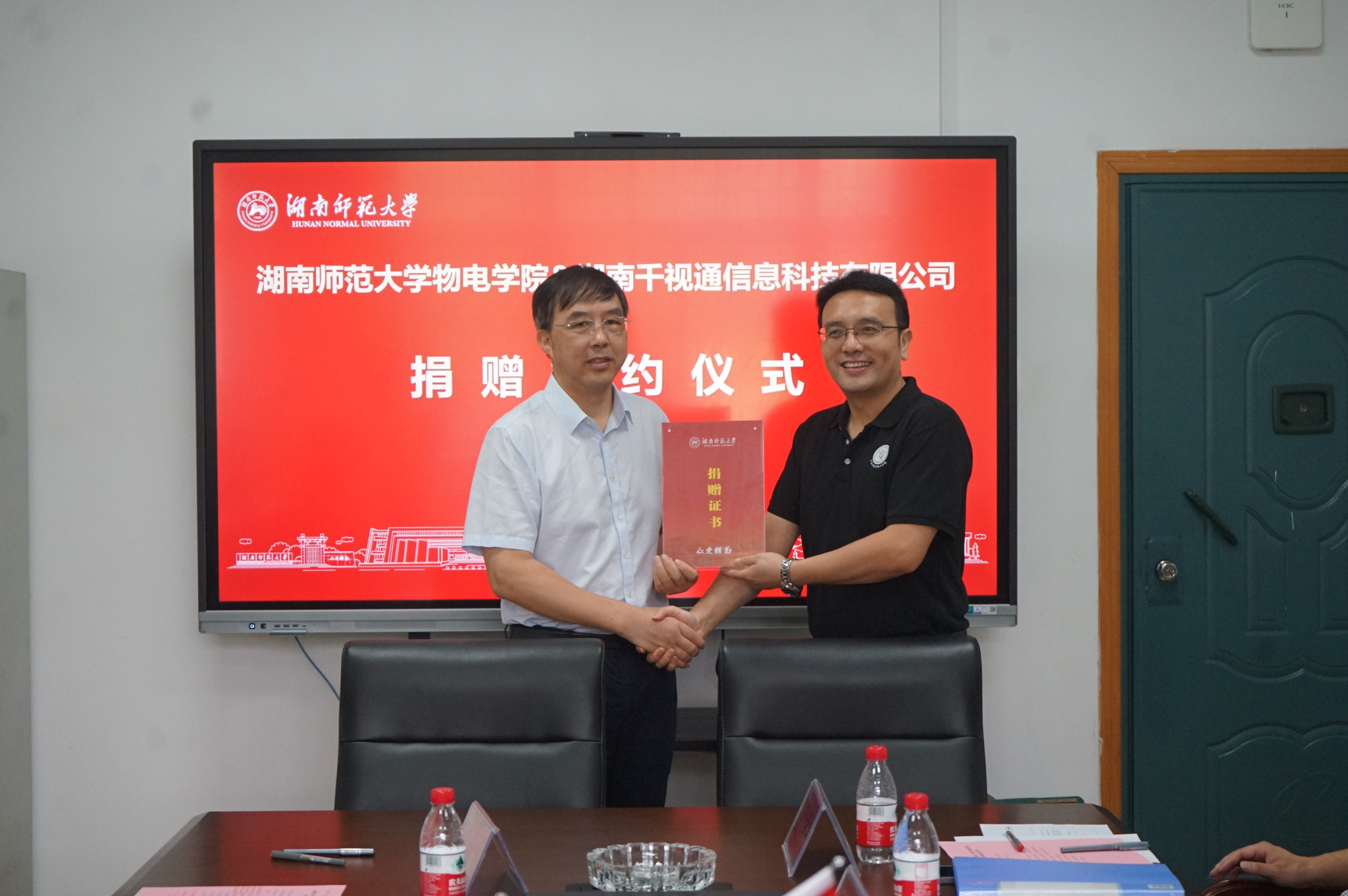 近日,湖南千视通信息科技有限公司捐赠签约仪式在我院格物楼316会议室举行。我院1988级优秀校友、苏州千视通董事长兼CEO李志前,我院党委副书记郭铭伟出席签约仪式。捐赠仪式由我院电子系系主任蒋乐勇主持。