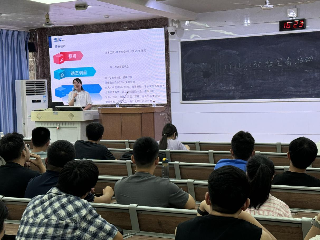 与此同时,公司招聘团队也在学院109教室针对我院即将毕业的研究生和本科生开展专场招聘会。长海公司人事曾勤经理团队详细介绍了公司的基本情况,并对本科、硕士、博士各个学历层次的薪资、福利、招聘岗位、专业要求、技术要求等情况进行了宣讲。同学们参与热情高涨,在宣讲之后踊跃提交简历,展示了很好的校企互动。