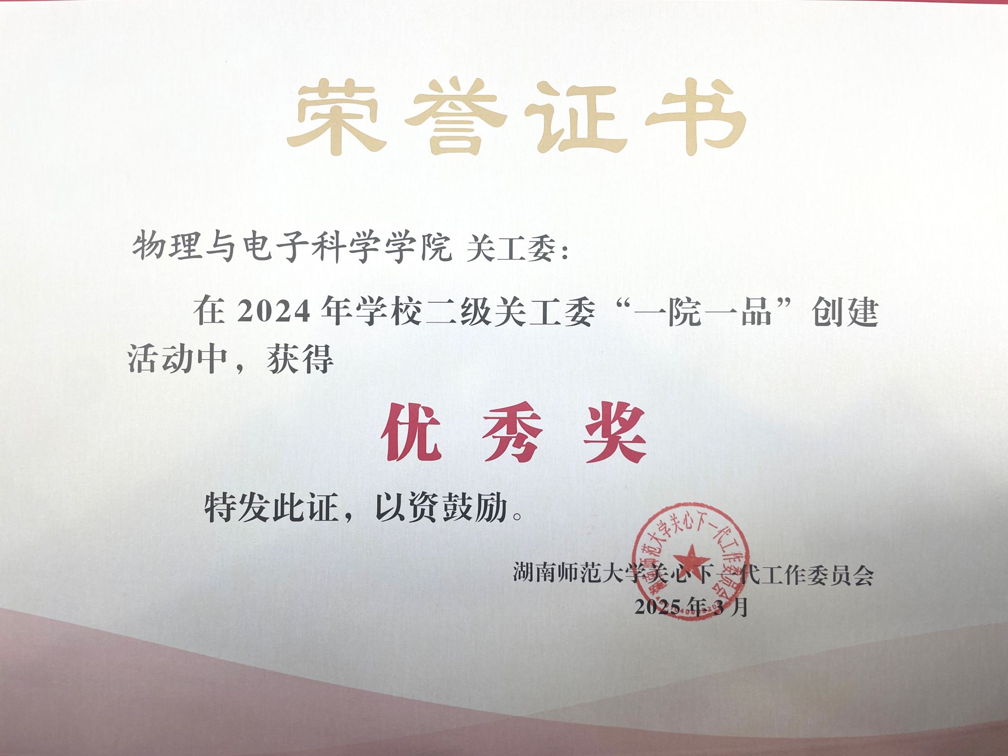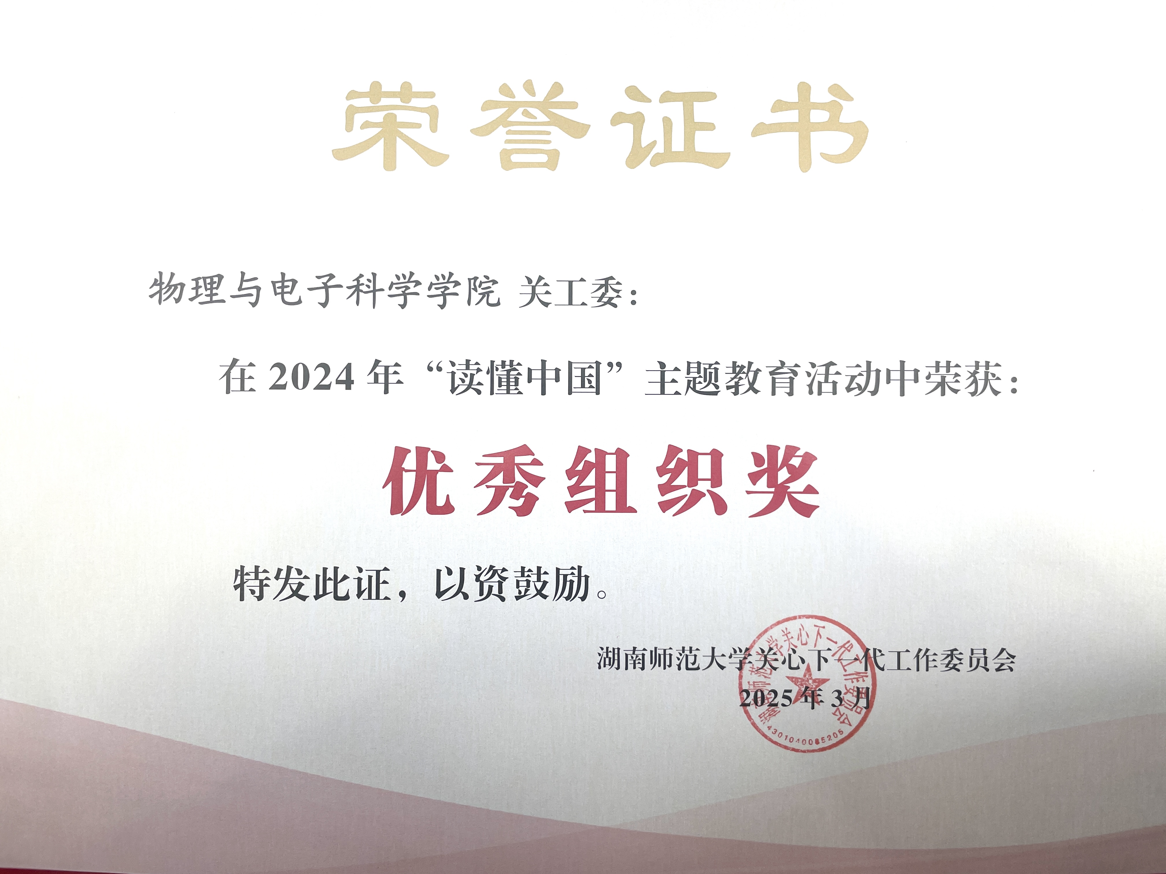 (通讯员 罗瑞霞)3月25日,诸侯ok1133关工委于地理科学学院301报告厅召开2025年工作会议。物电院关工委荣获学校第一批“五好“基层关工委,“读懂中国”主题教育活动优秀组织单位,“一院一品”优秀项目单位,物电院关工委为包揽三大奖项的两家单位之一。院长刘红荣、党委书记罗嵘被评为“关工委工作积极支持者”,党委副书记郭铭伟、关工委常务副主任唐咸林被评为“关工委工作先进个人”。