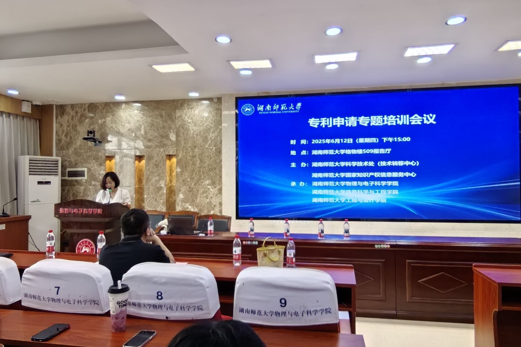 陈涛表示,专利申请是科技成果转化的核心纽带,是师生科研工作的关键引擎。她列举了刘少军院士团队的八件专利作价入股2500万元与企业合作创办公司,2025年该团队又有六件专利作价1117万元入注所创办公司进行增资扩股,促进专利成果转化与产业化。还列举了石化新材料国家工程实验室团队的6件专利作价1003万元成立师大化工新材料有限公司,及孙舜尧教授团队的5件专利作价500万元给公司增资扩股,助力湘绣创新研发与产业化发展。这些专利转化案例都得益于高质量专利保护,而高价值专利为技术转移、校企合作夯实基础,为科研价值向经济价值转化提供保障。所以,专利申请,既可保护创新成果,打通转化链路,又可赋能学术创新,拓展科研资源。通过此次“专利申请专题培训”活动,强化师生知识产权保护意识,进一步规范专利申请,提升专利质量,培育高价值专利,促进专利成果转化,为学校科技创新与学科建设作出贡献。科技处从国家知识产权政策、学校专利申请流程、专利申请预审要求及非正常专利申请规定四个方面进行了宣讲。